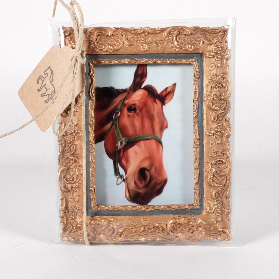 These mini framed prints are roughly 4"x 5" (varying slightly depending on the frame style). These can sit on a tabletop/shelf or can hang on a wall.