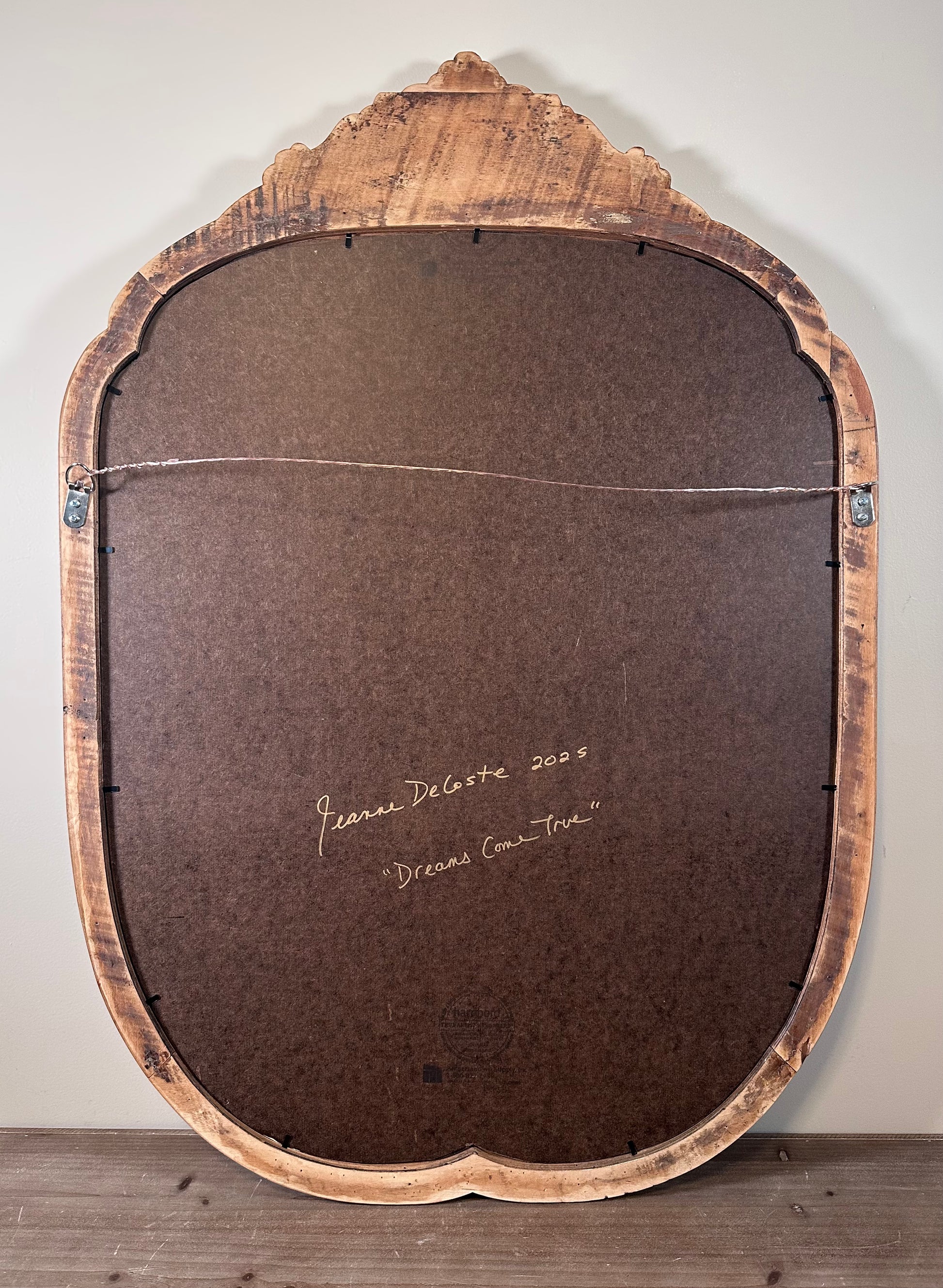 This oil painting is 24-5/8” wide and 35” tall. This landscape painting is custom made to fit into this wooden frame I found that used to hold an old mirror. The wood is honey colored and the carved details at the top add character and charm to this piece. This painting is wired and ready to hang on your wall.