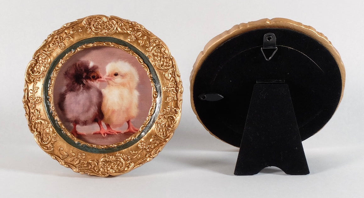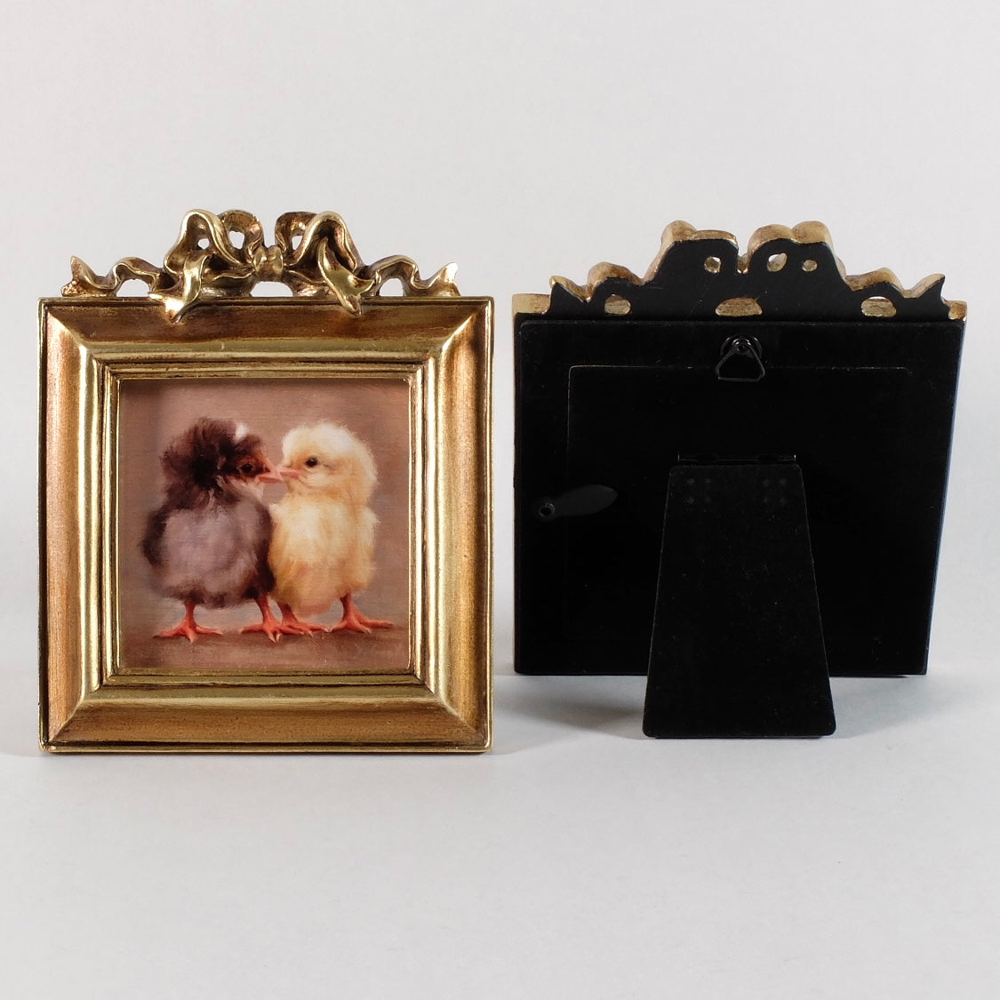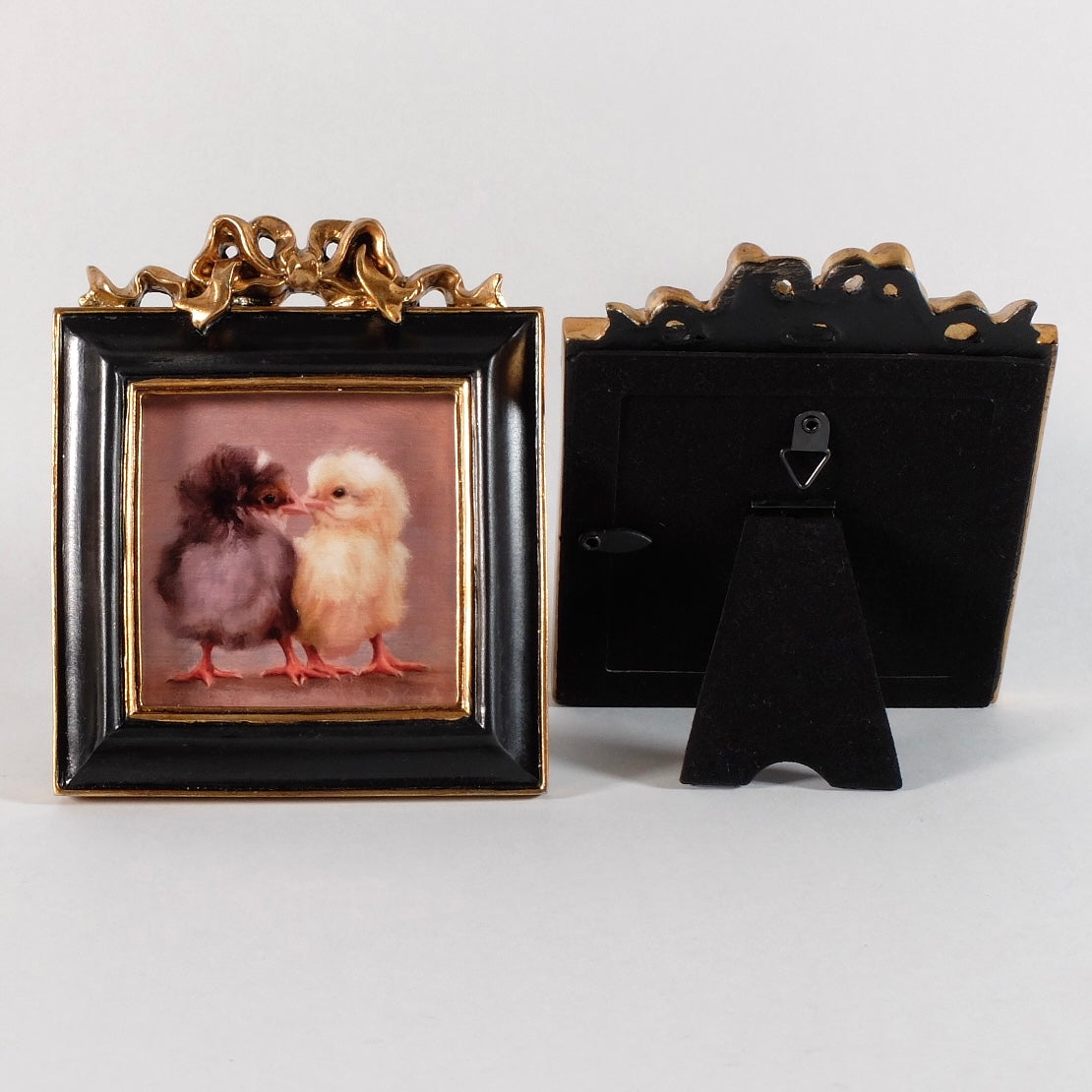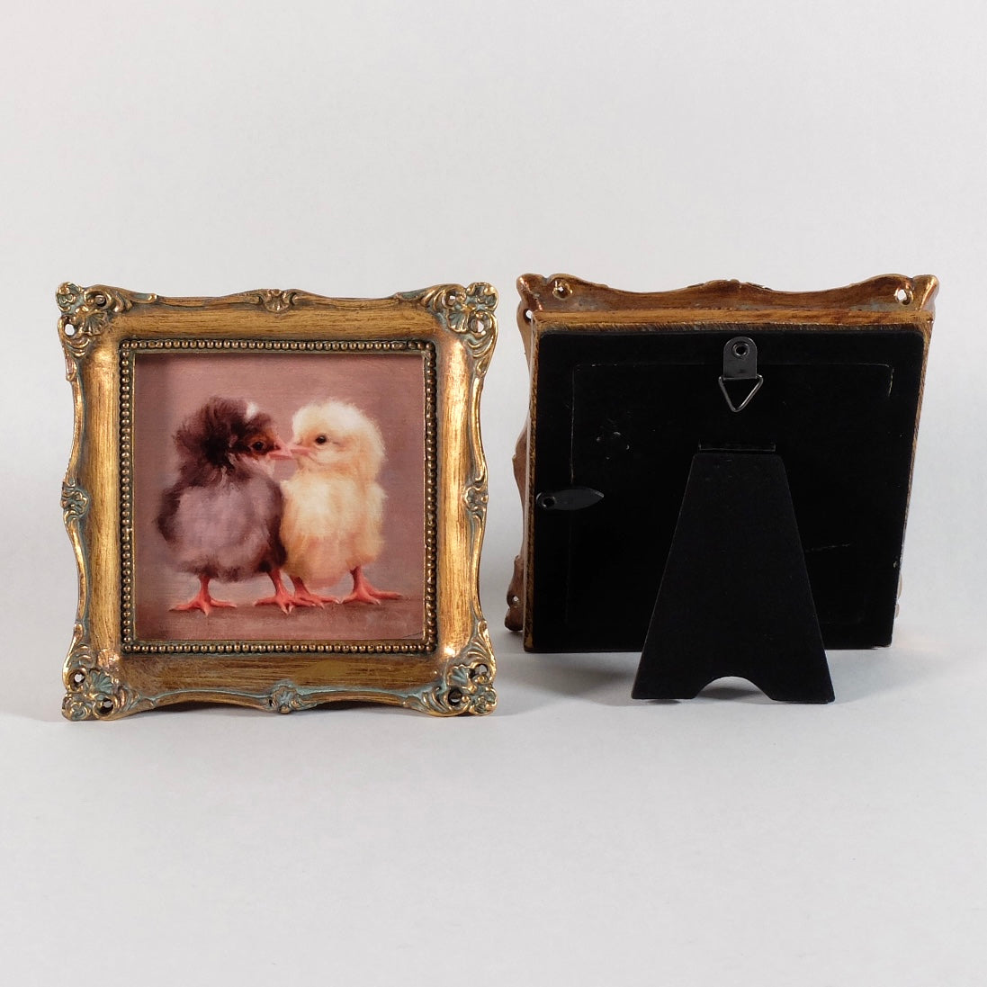 These mini framed prints are roughly 4"x 4" (varying slightly depending on the frame style). These can sit on a tabletop/shelf or can hang on a wall.