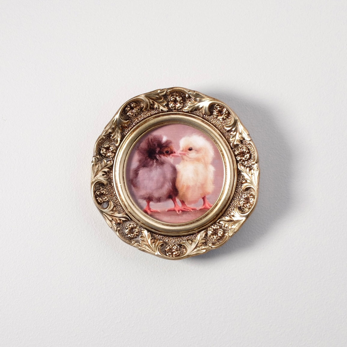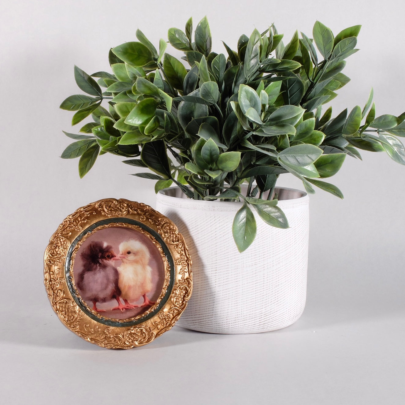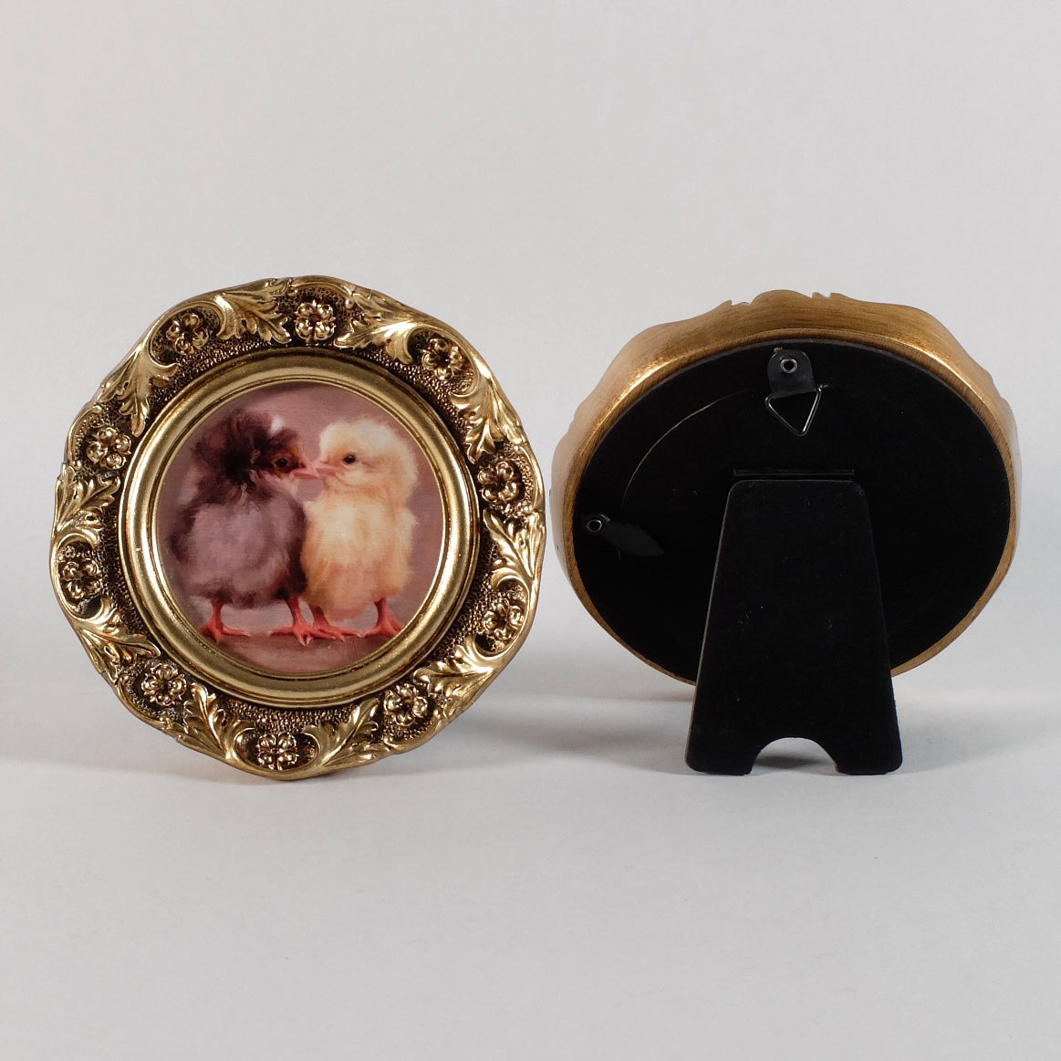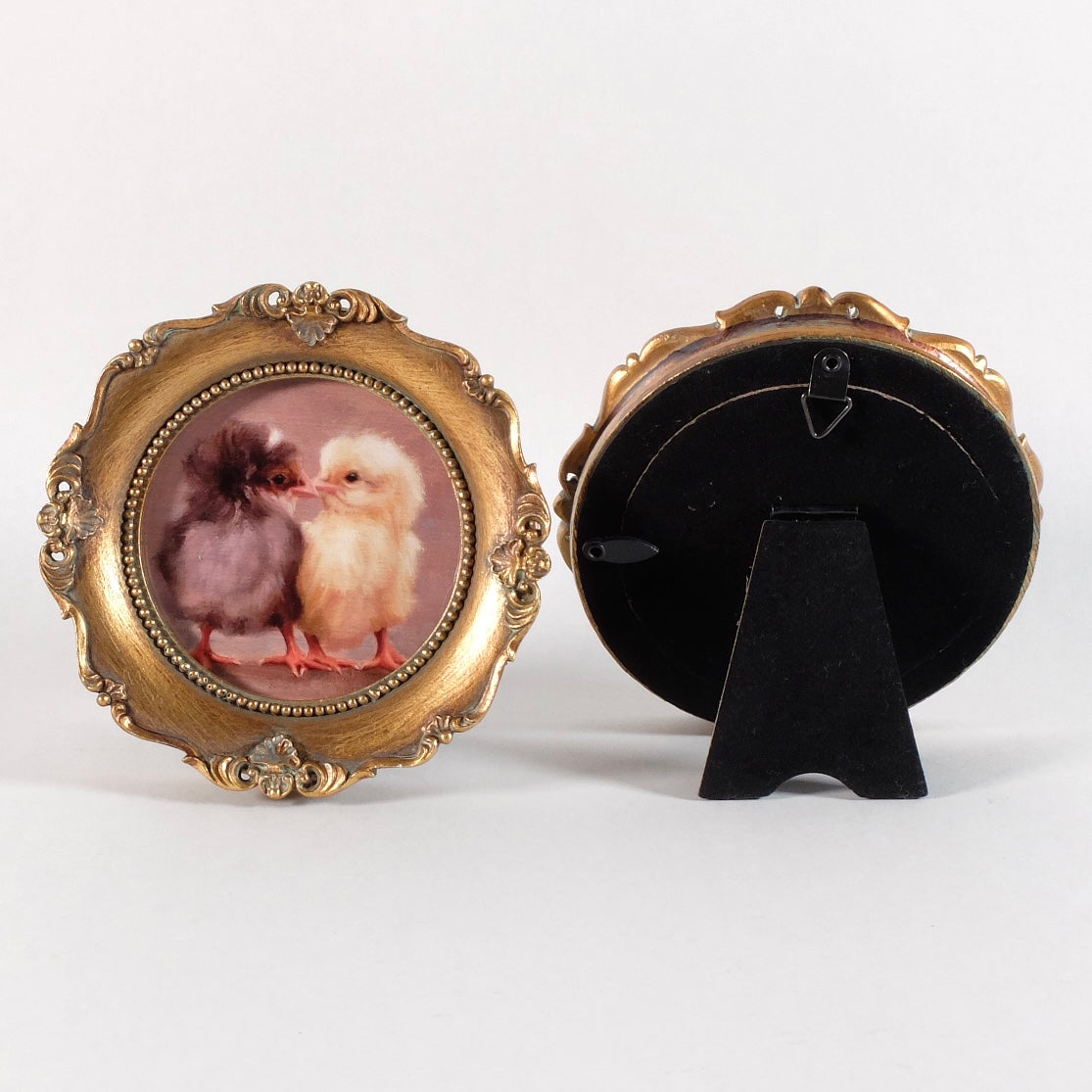 These mini framed prints are roughly 4"x 4" (varying slightly depending on the frame style). These can sit on a tabletop/shelf or can hang on a wall.