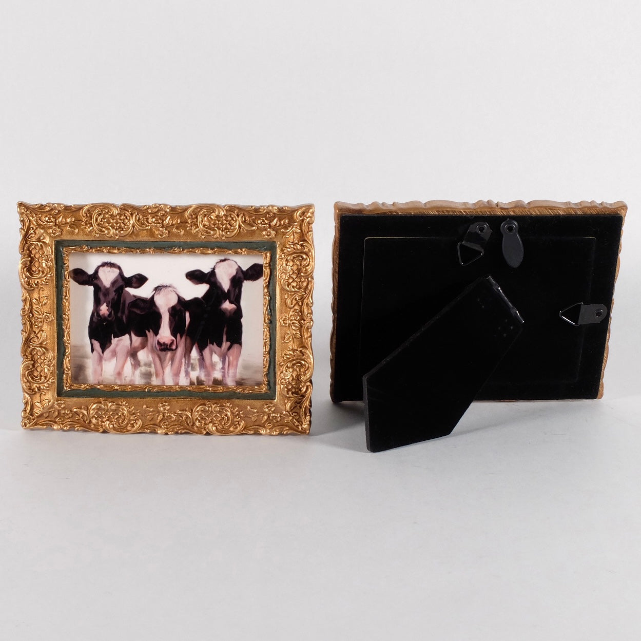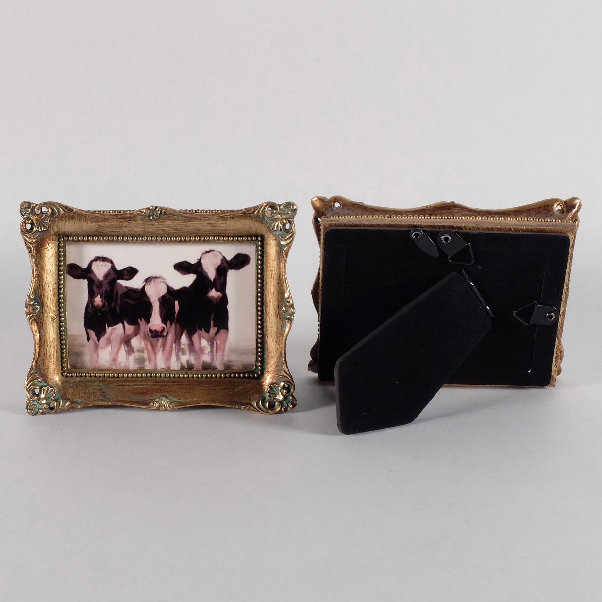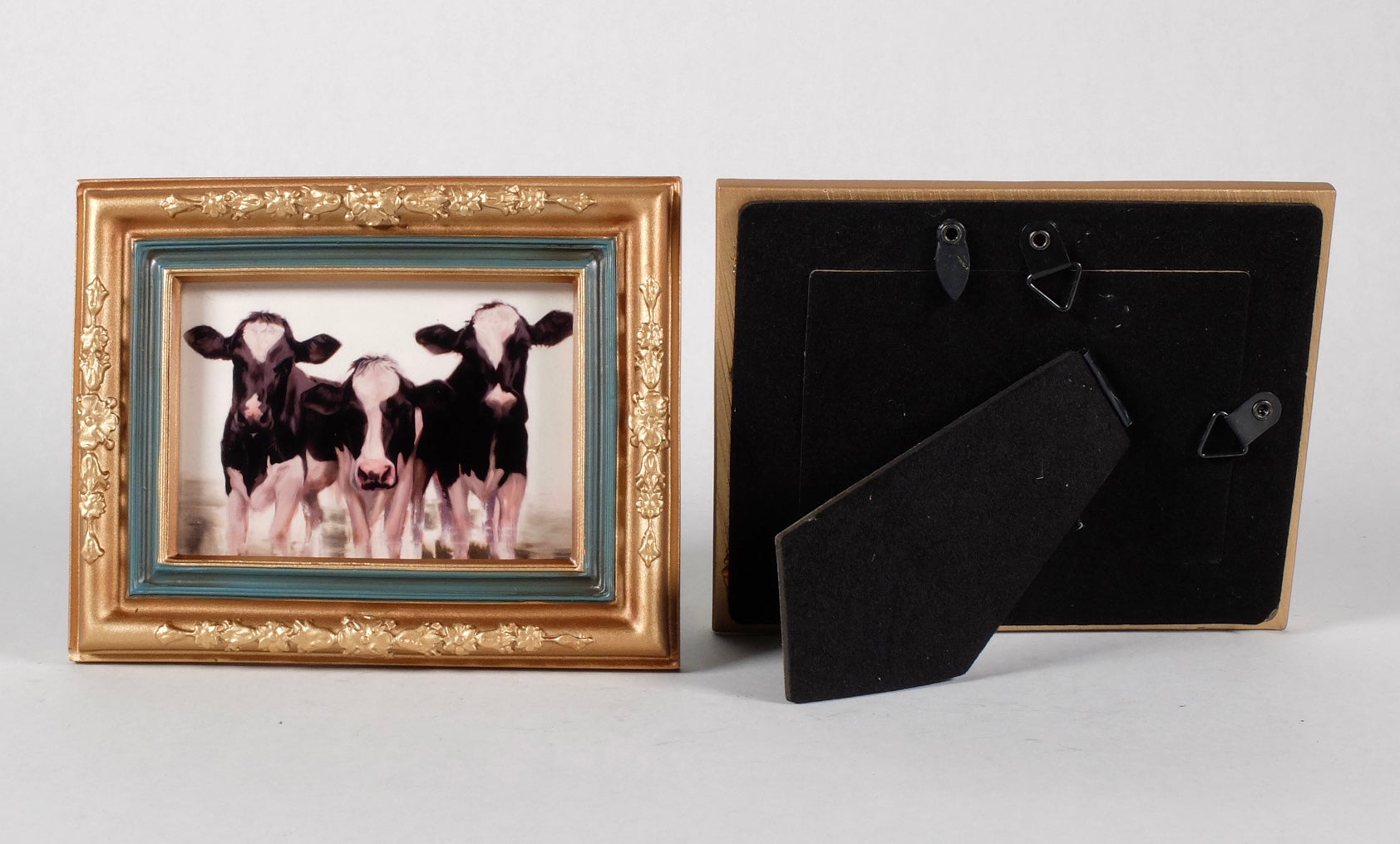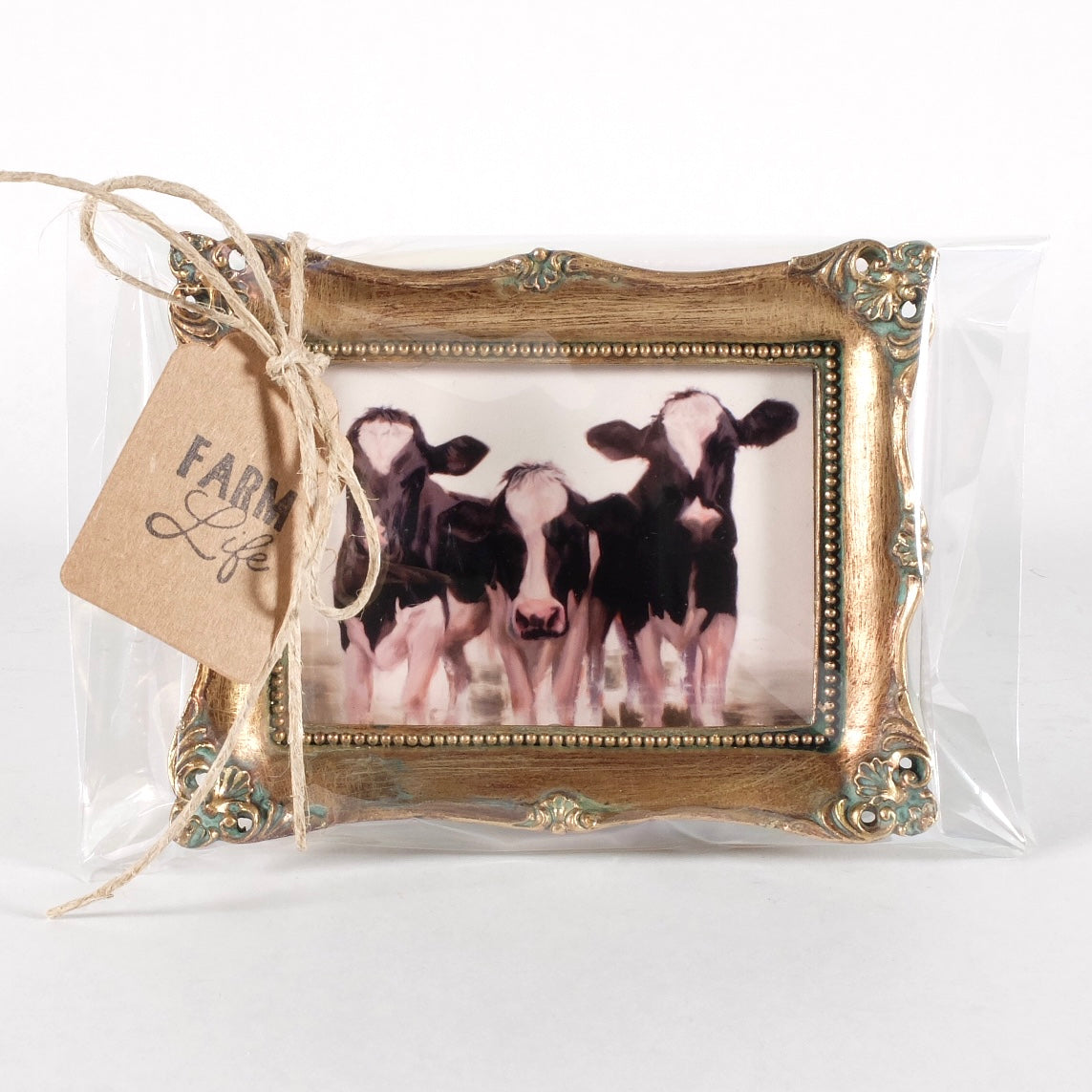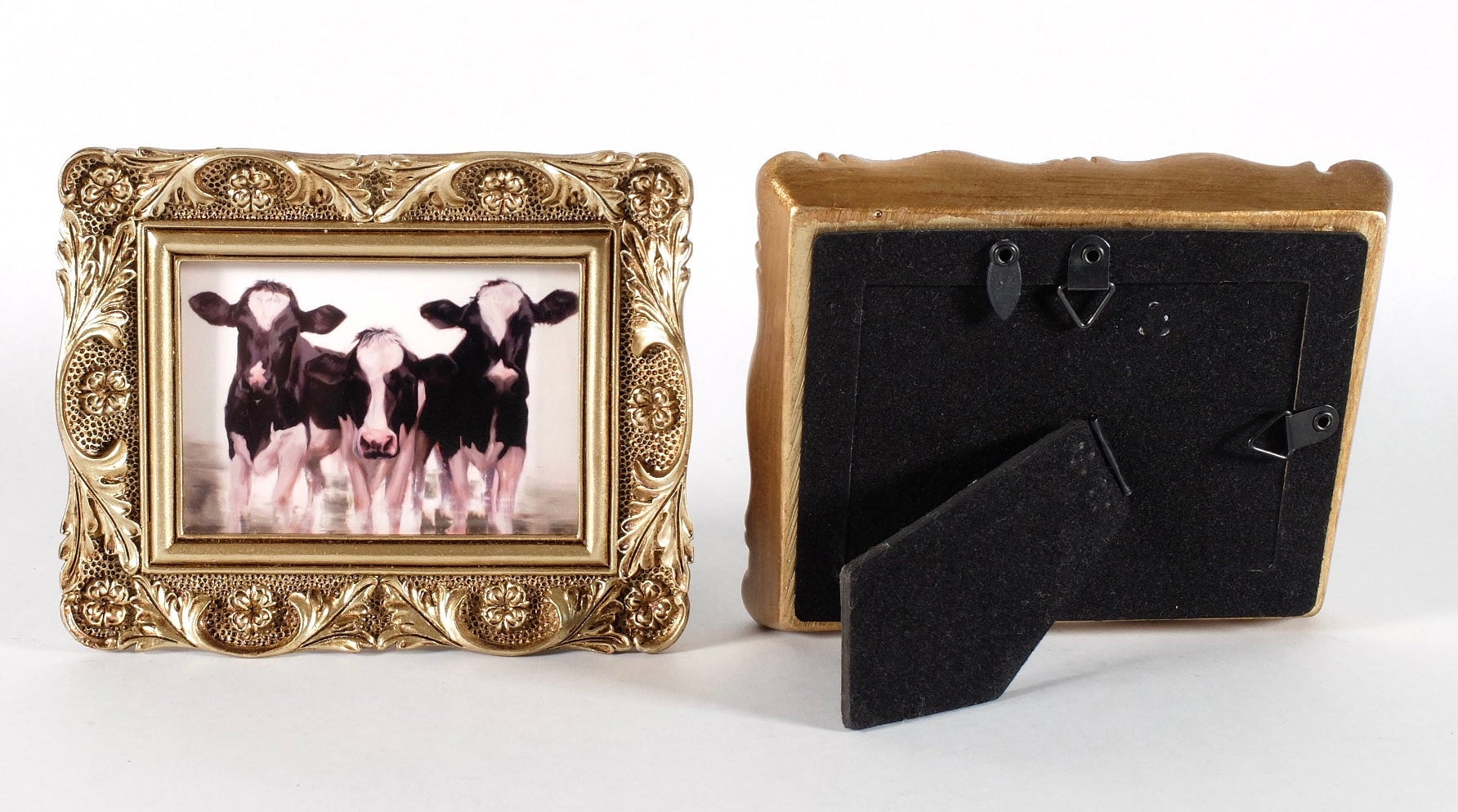 These mini framed prints are roughly 4"x 5" (varying slightly depending on the frame style). These can sit on a tabletop/shelf or can hang on a wall.