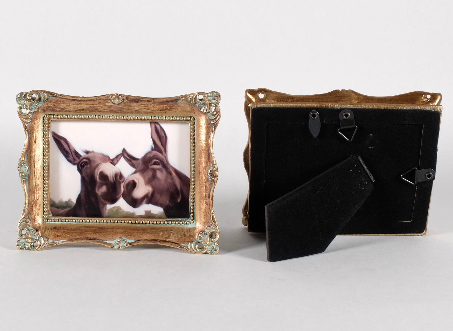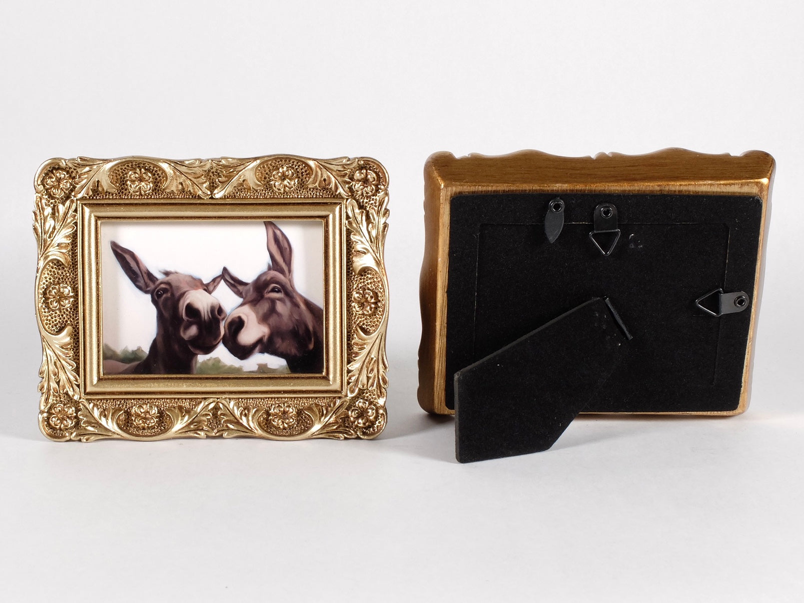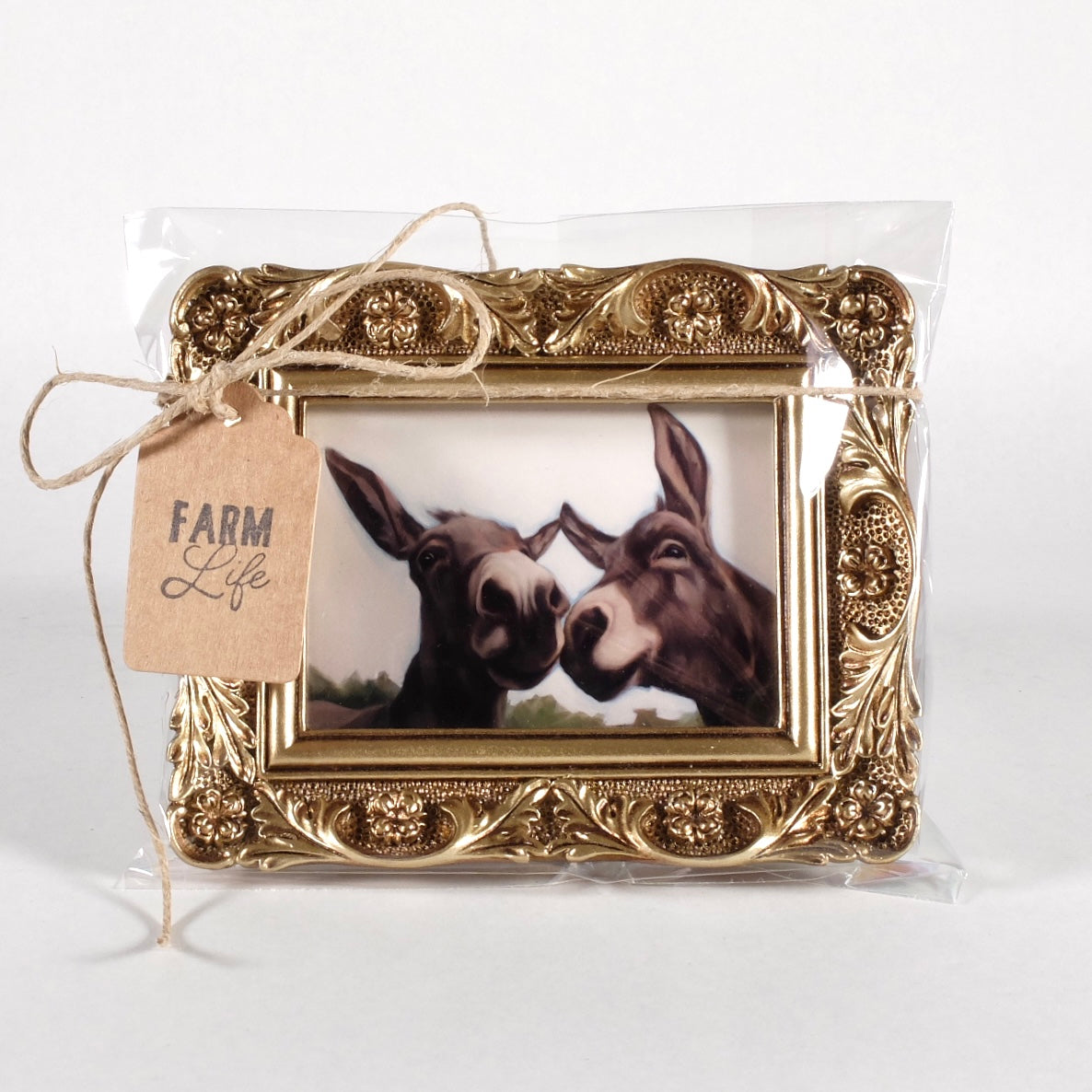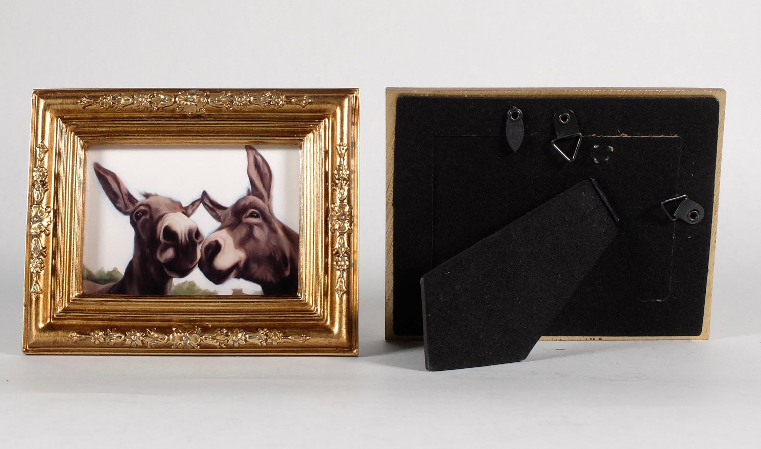 These mini framed prints are roughly 4"x 5" (varying slightly depending on the frame style). These can sit on a tabletop/shelf or can hang on a wall.