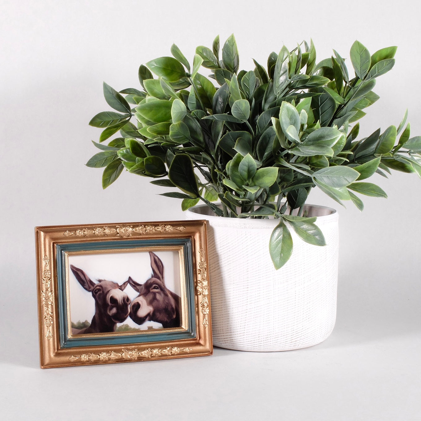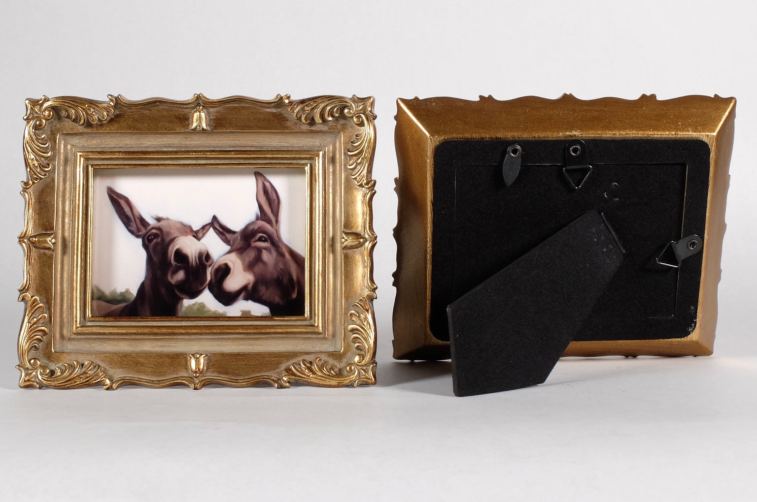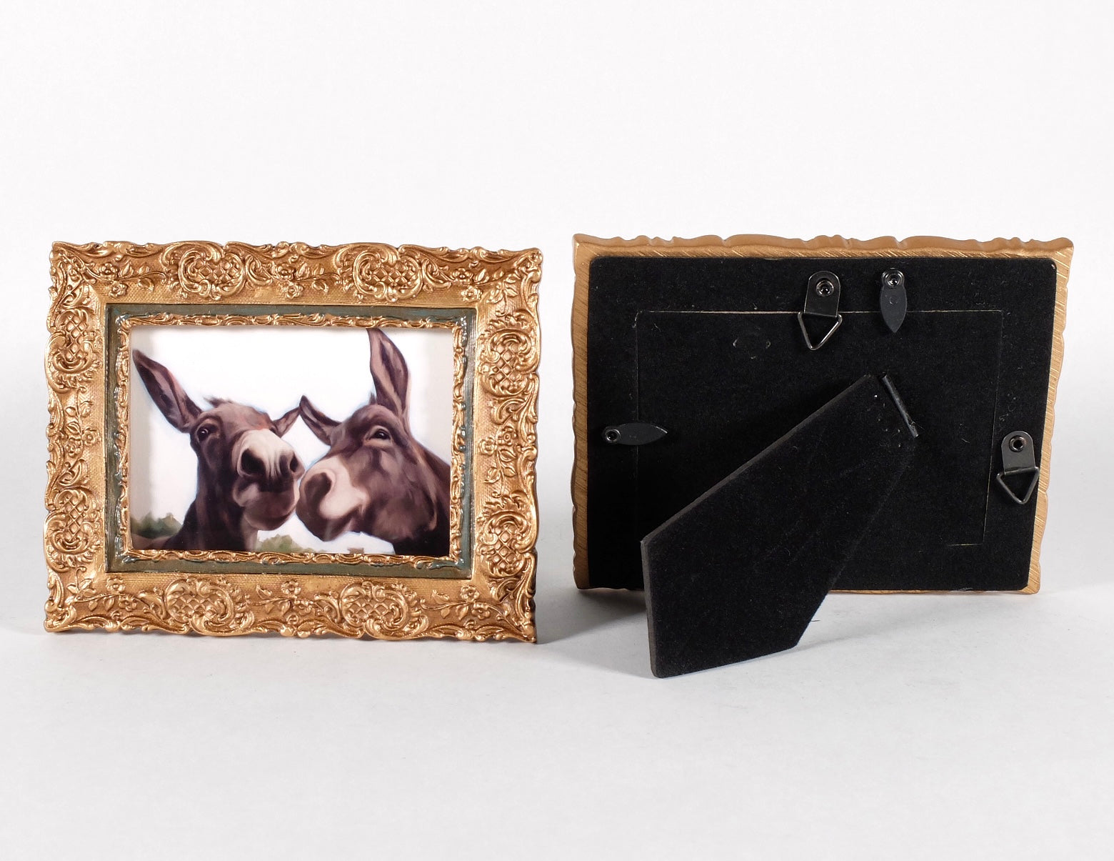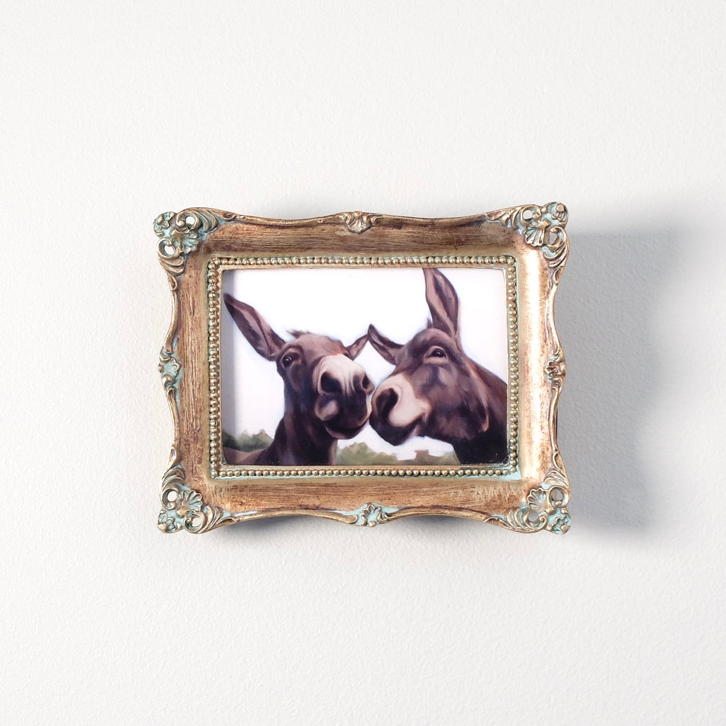 These mini framed prints are roughly 4"x 5" (varying slightly depending on the frame style). These can sit on a tabletop/shelf or can hang on a wall.