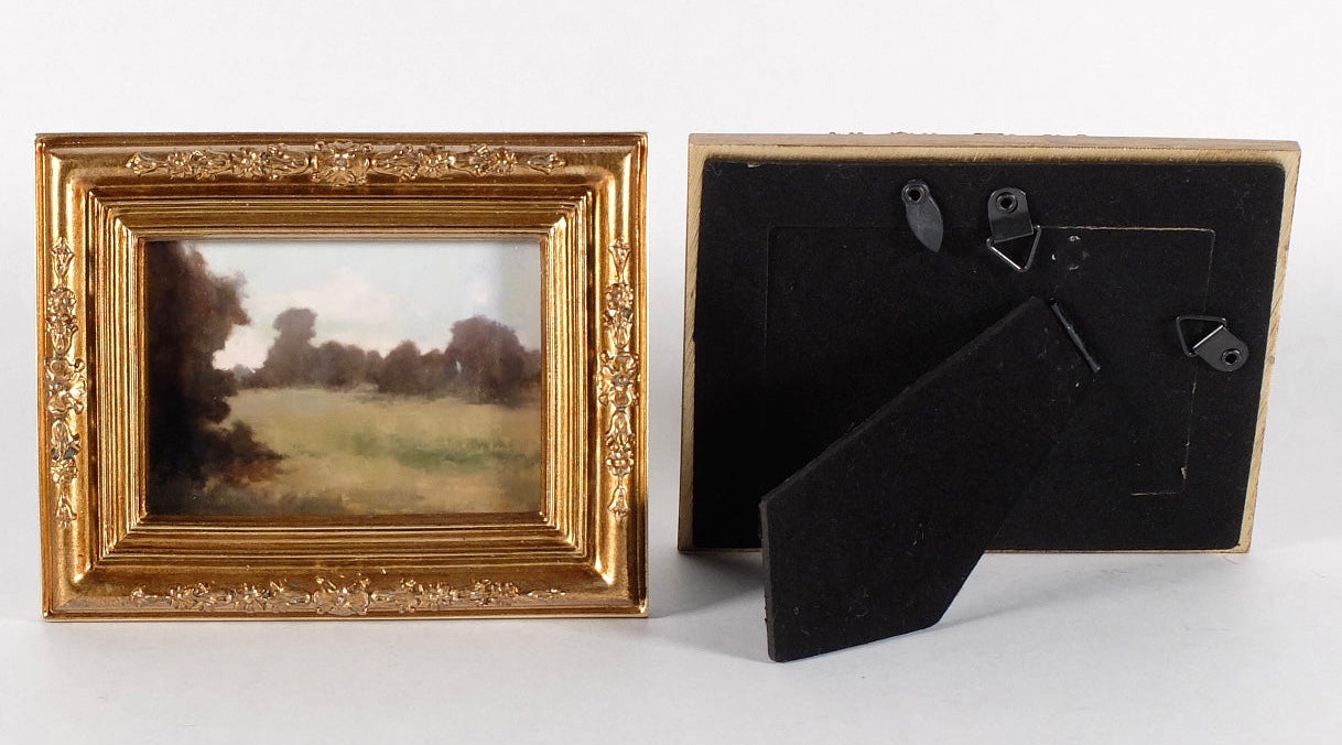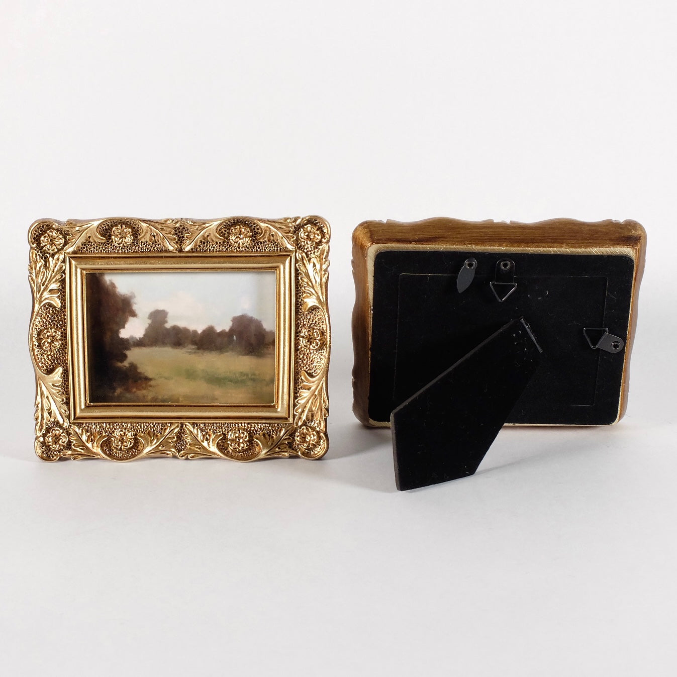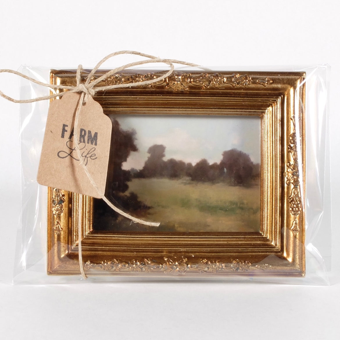 These mini framed prints are roughly 4"x 5" (varying slightly depending on the frame style). These can sit on a tabletop/shelf or can hang on a wall.