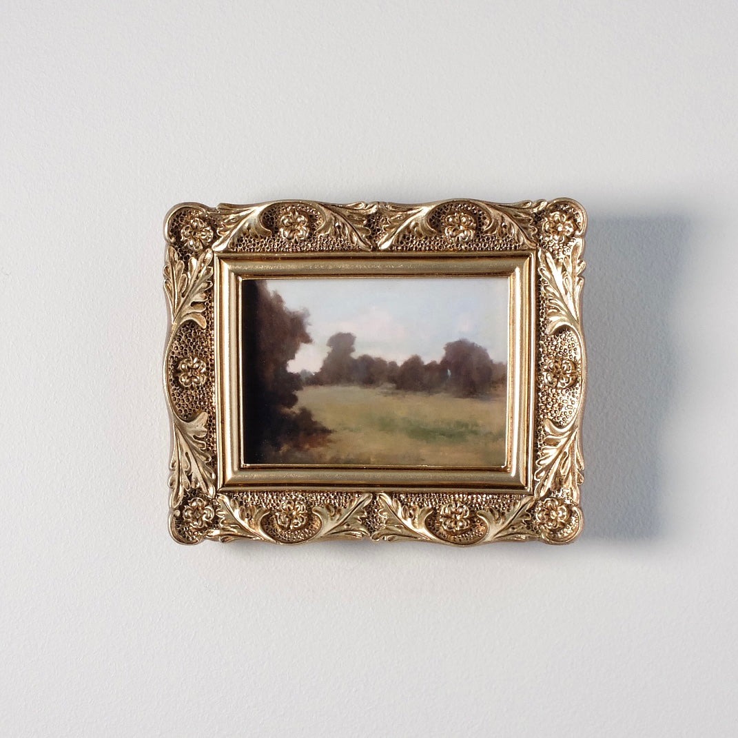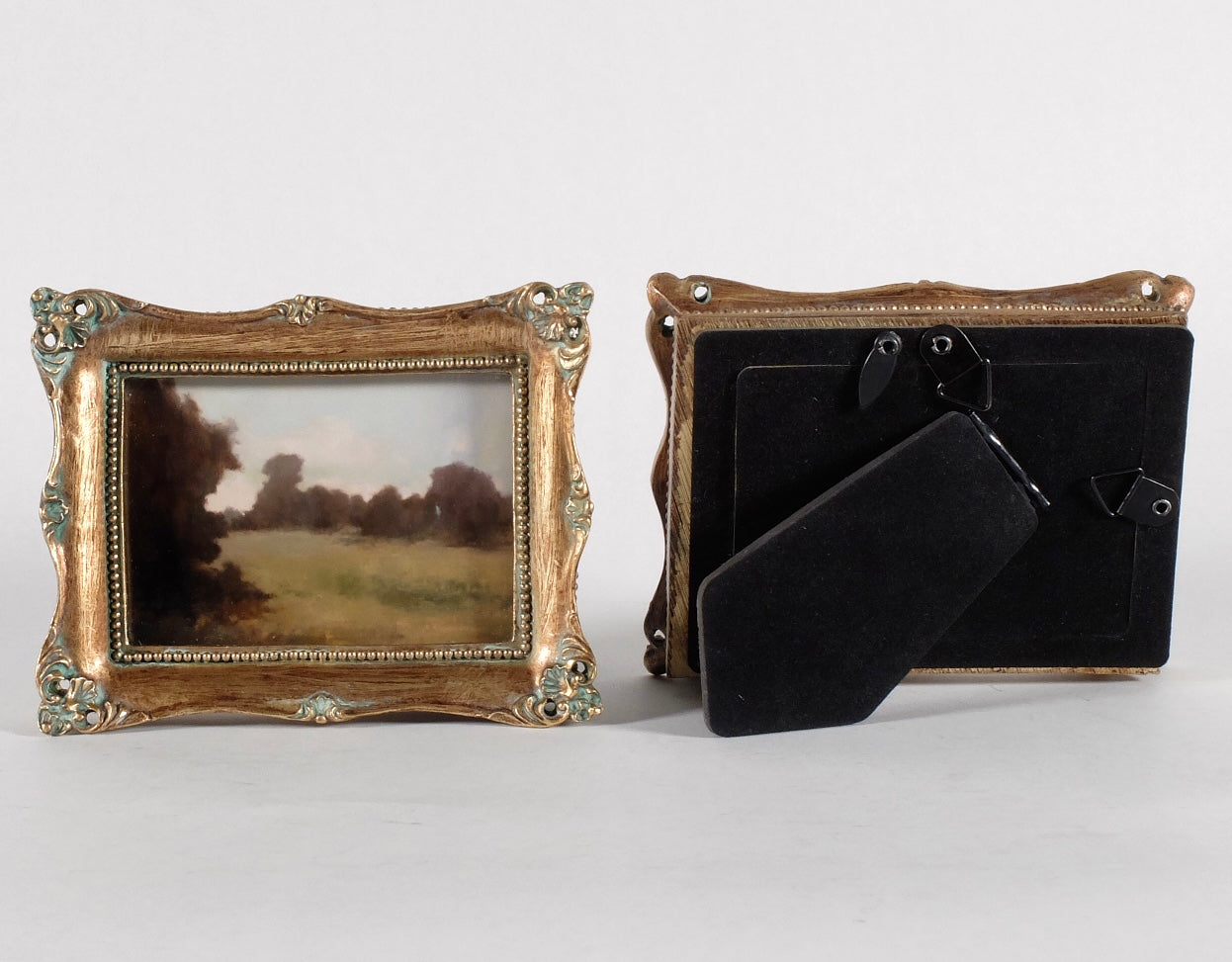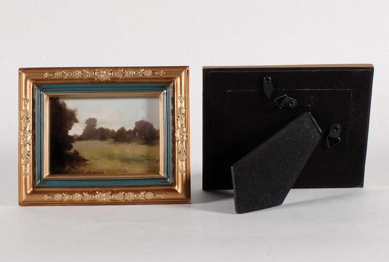 These mini framed prints are roughly 4"x 5" (varying slightly depending on the frame style). These can sit on a tabletop/shelf or can hang on a wall.