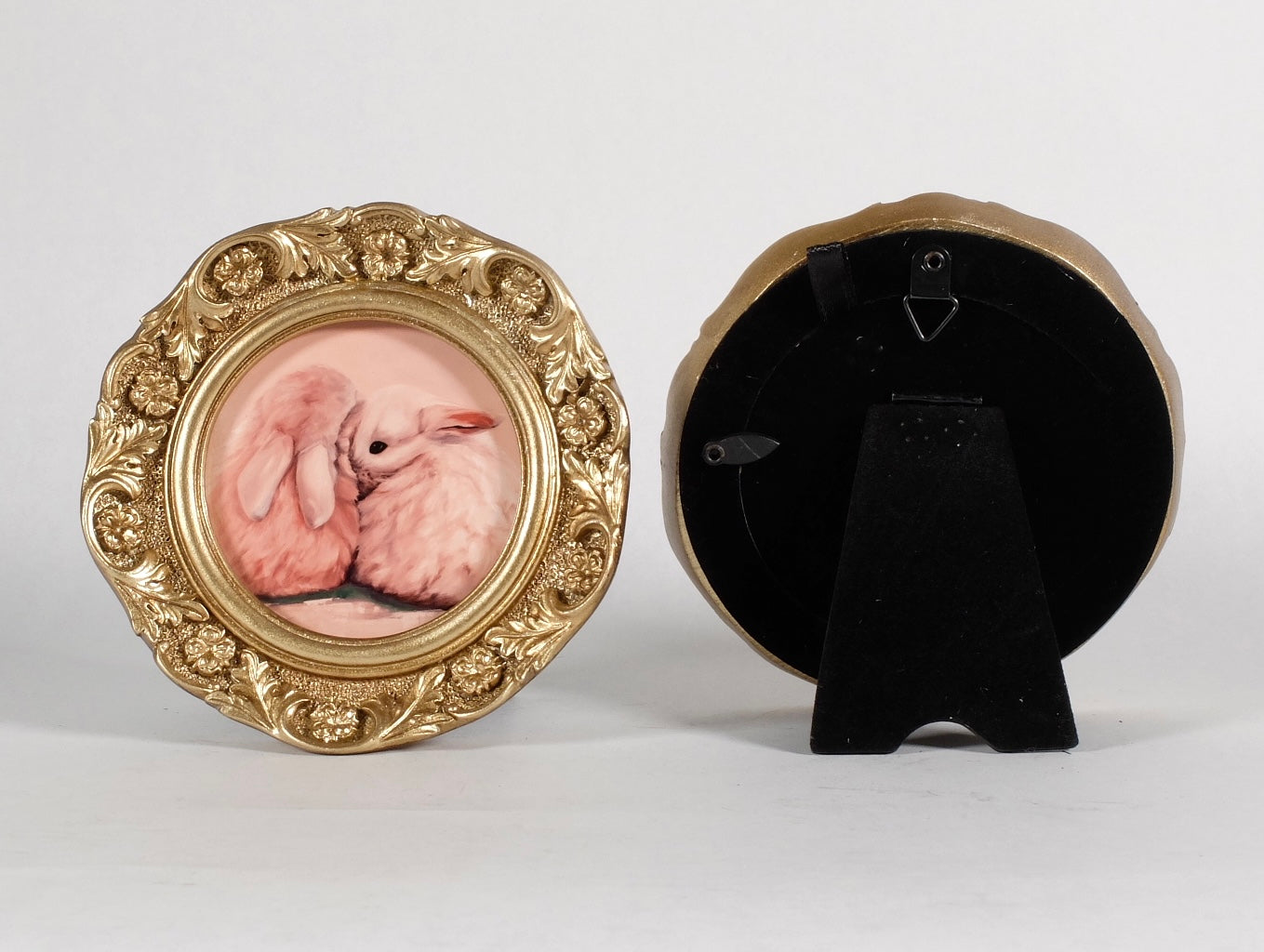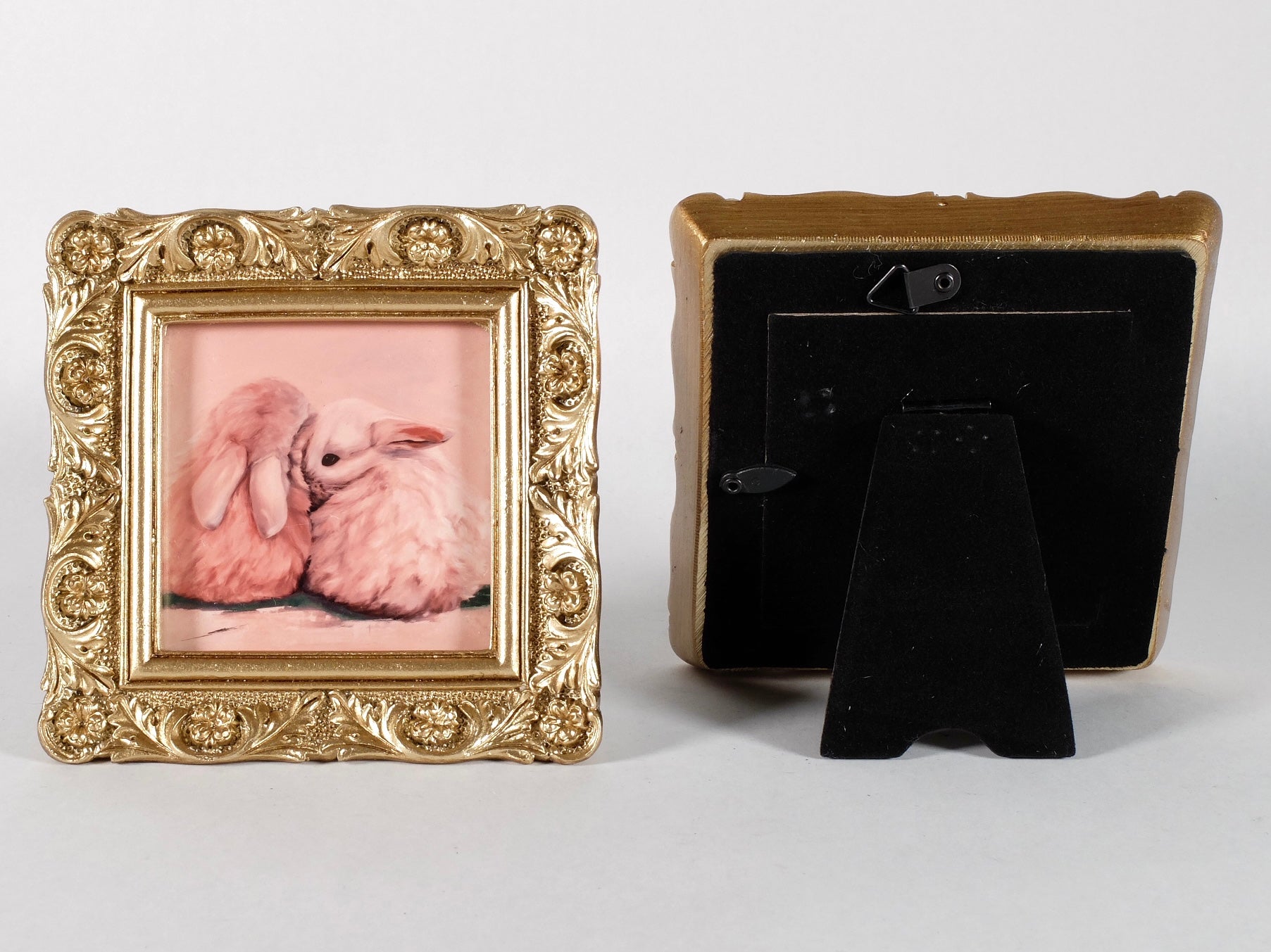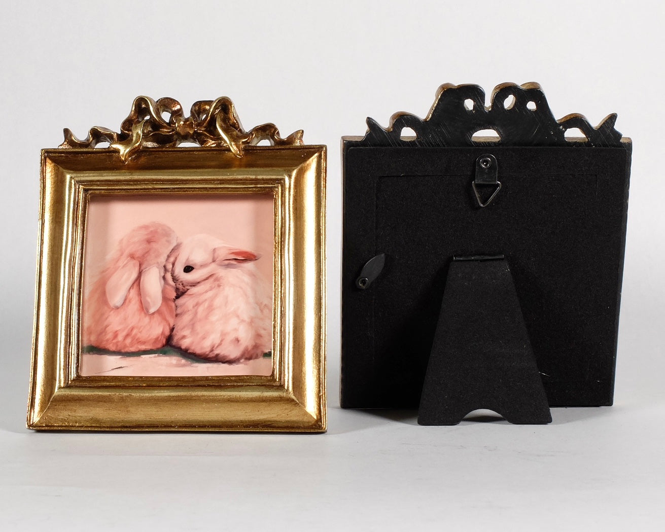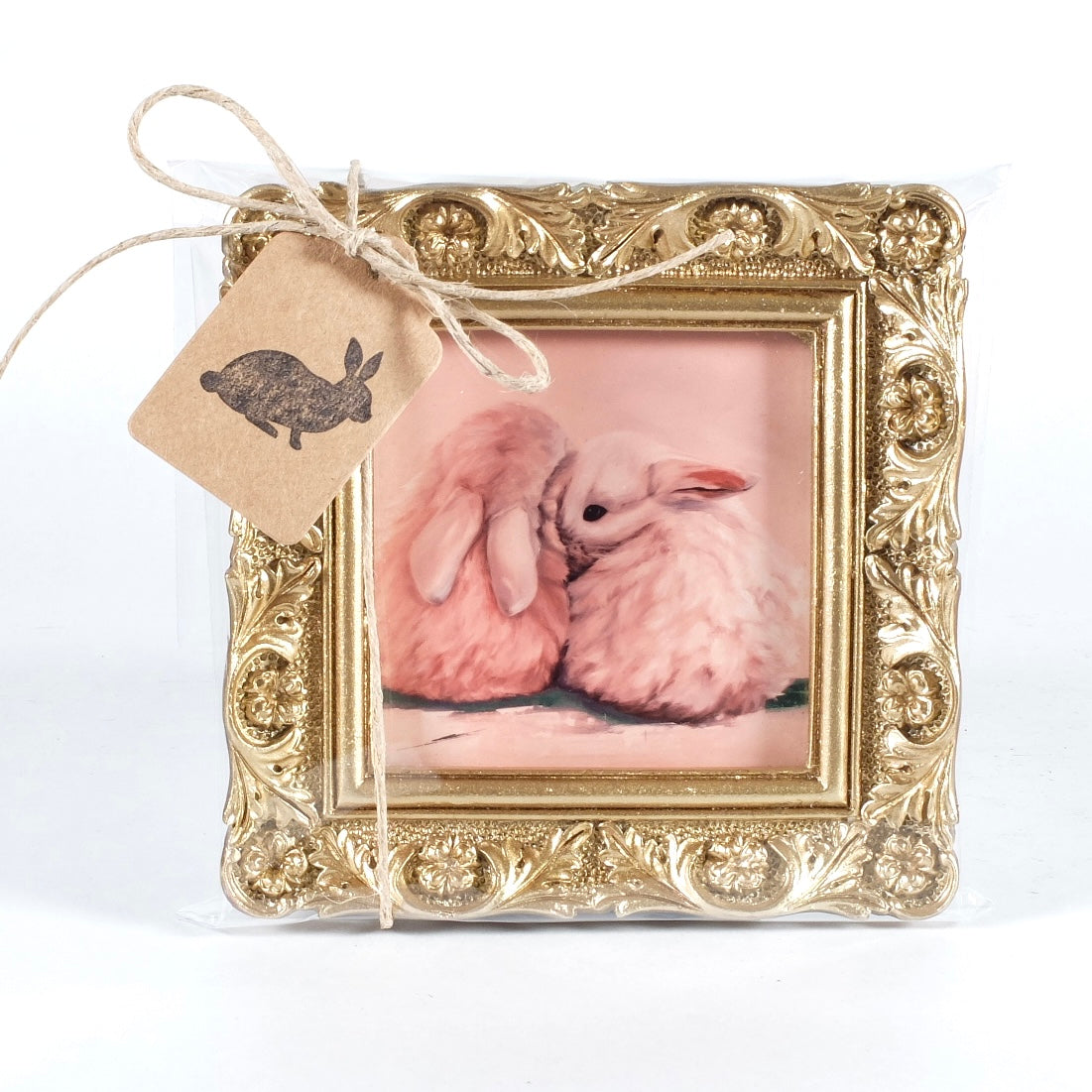 These mini framed prints are roughly 4"x 4" (varying slightly depending on the frame style). These can sit on a tabletop/shelf or can hang on a wall.