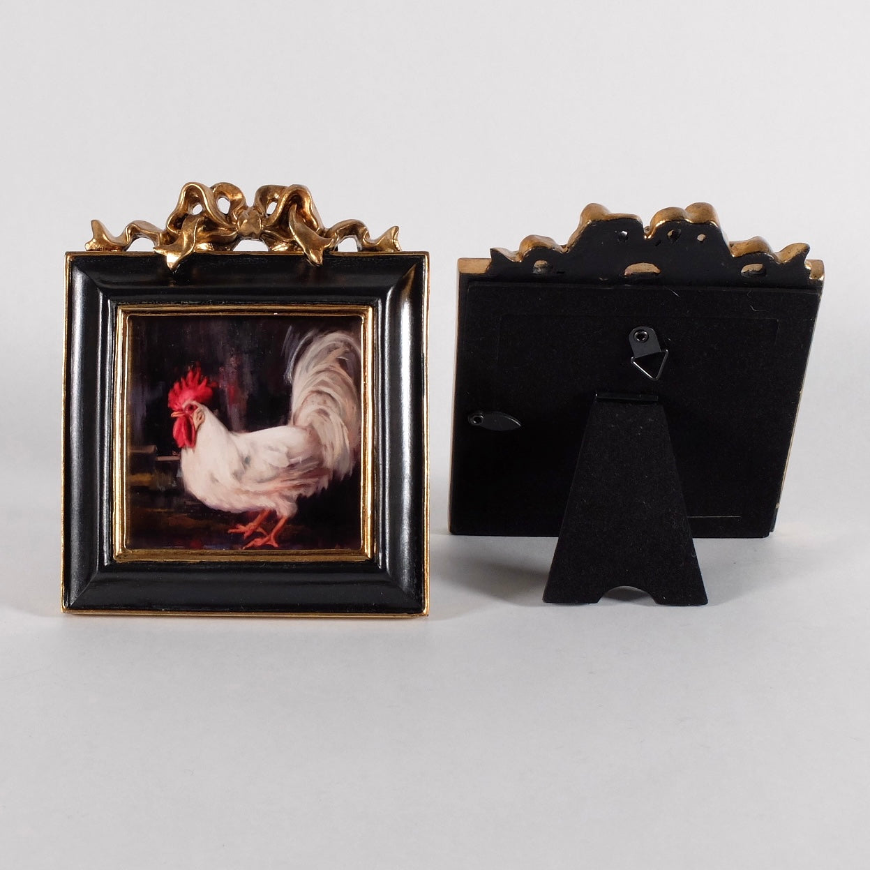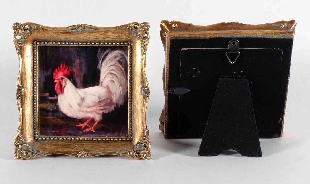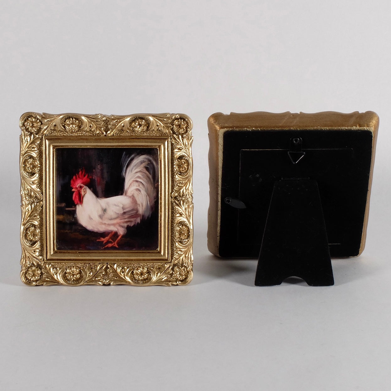These mini framed prints are roughly 4"x 4" (varying slightly depending on the frame style). These can sit on a tabletop/shelf or can hang on a wall.