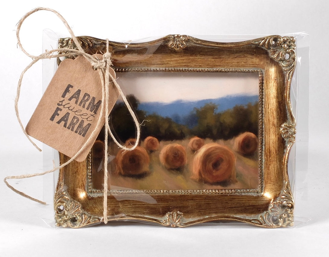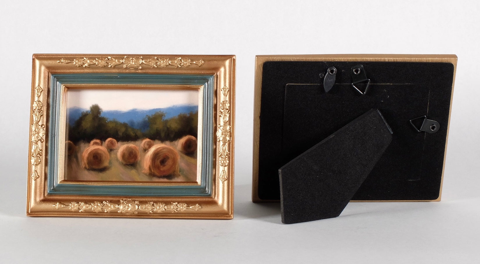 These mini framed prints are roughly 4"x 5" (varying slightly depending on the frame style). These can sit on a tabletop/shelf or can hang on a wall.