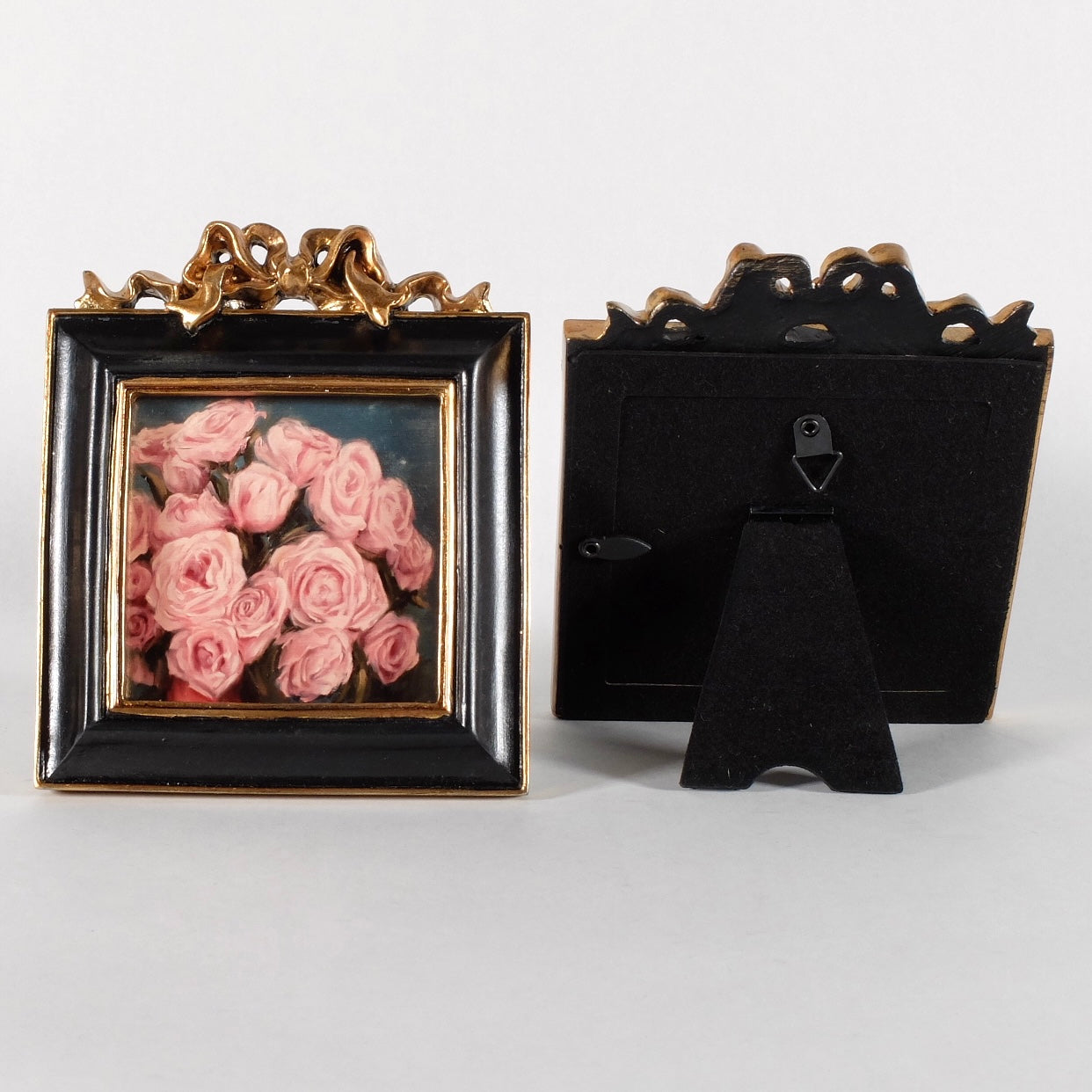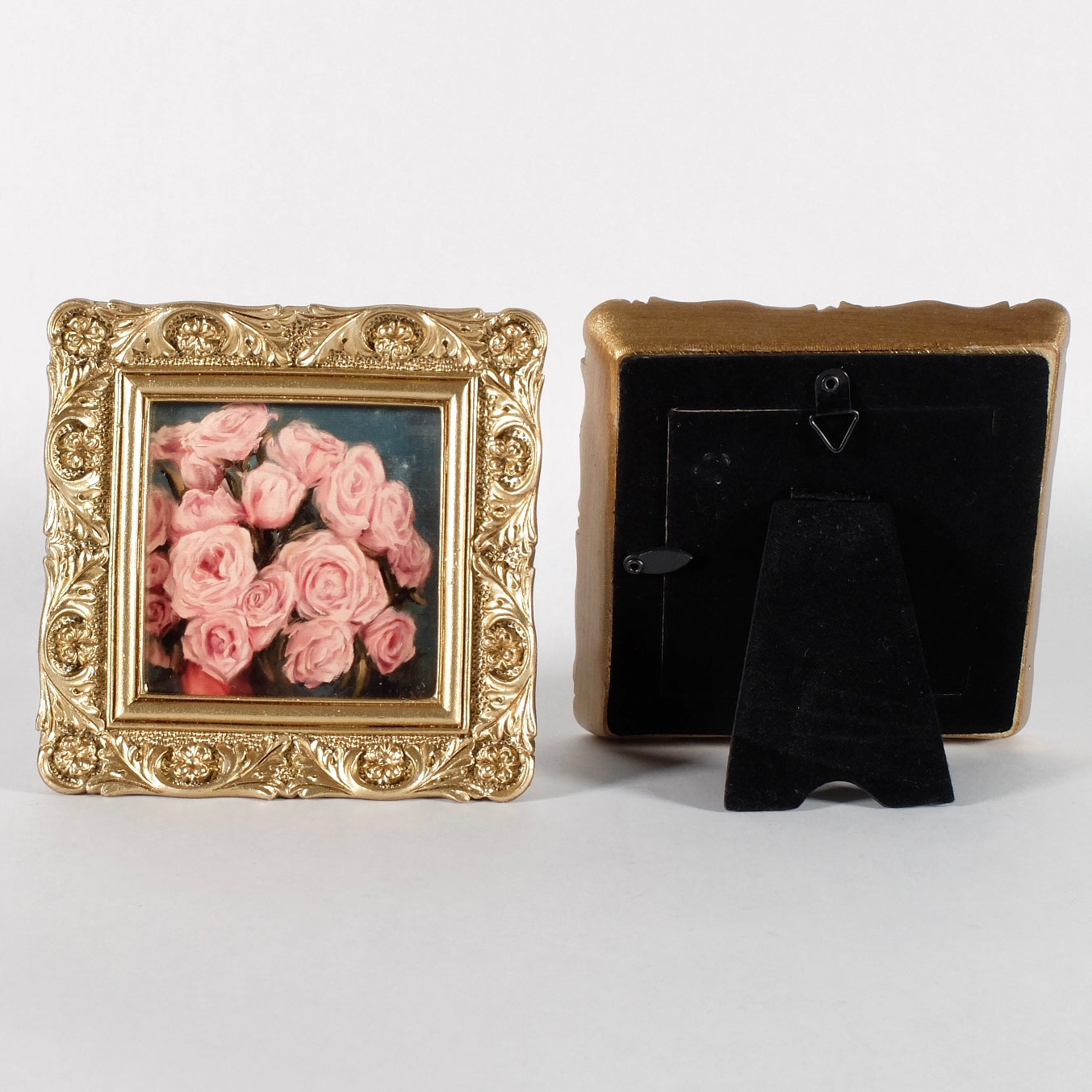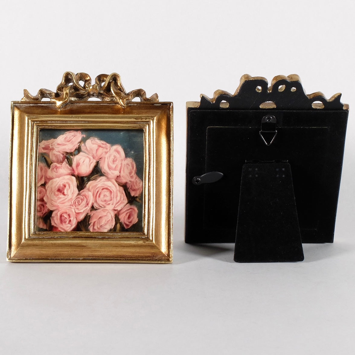 These mini framed prints are roughly 4"x 4" (varying slightly depending on the frame style). These can sit on a tabletop/shelf or can hang on a wall.
