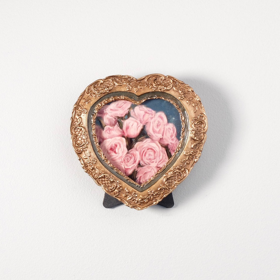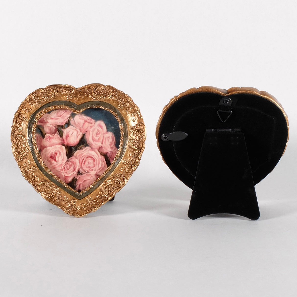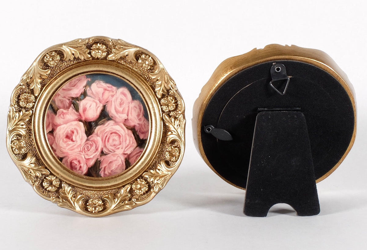 These mini framed prints are roughly 4"x 4" (varying slightly depending on the frame style). These can sit on a tabletop/shelf or can hang on a wall.