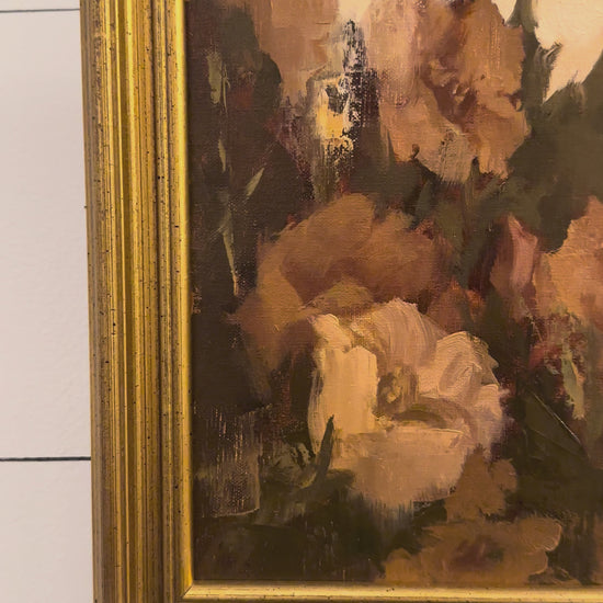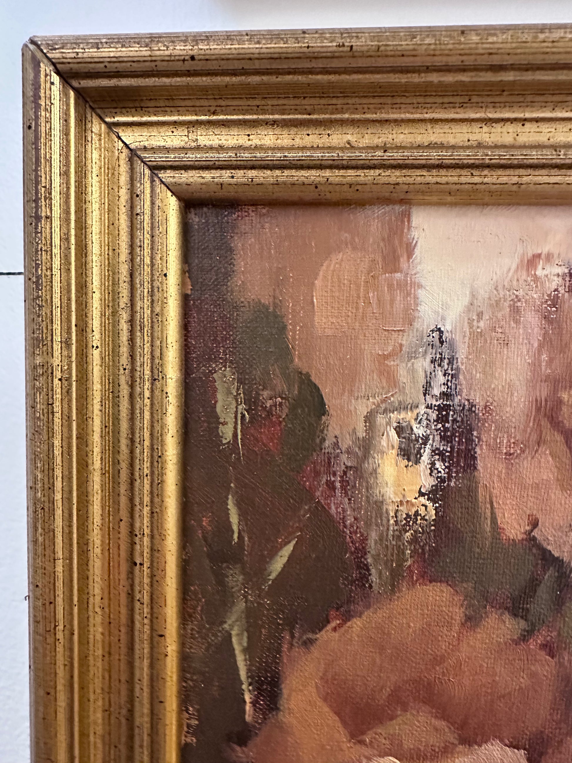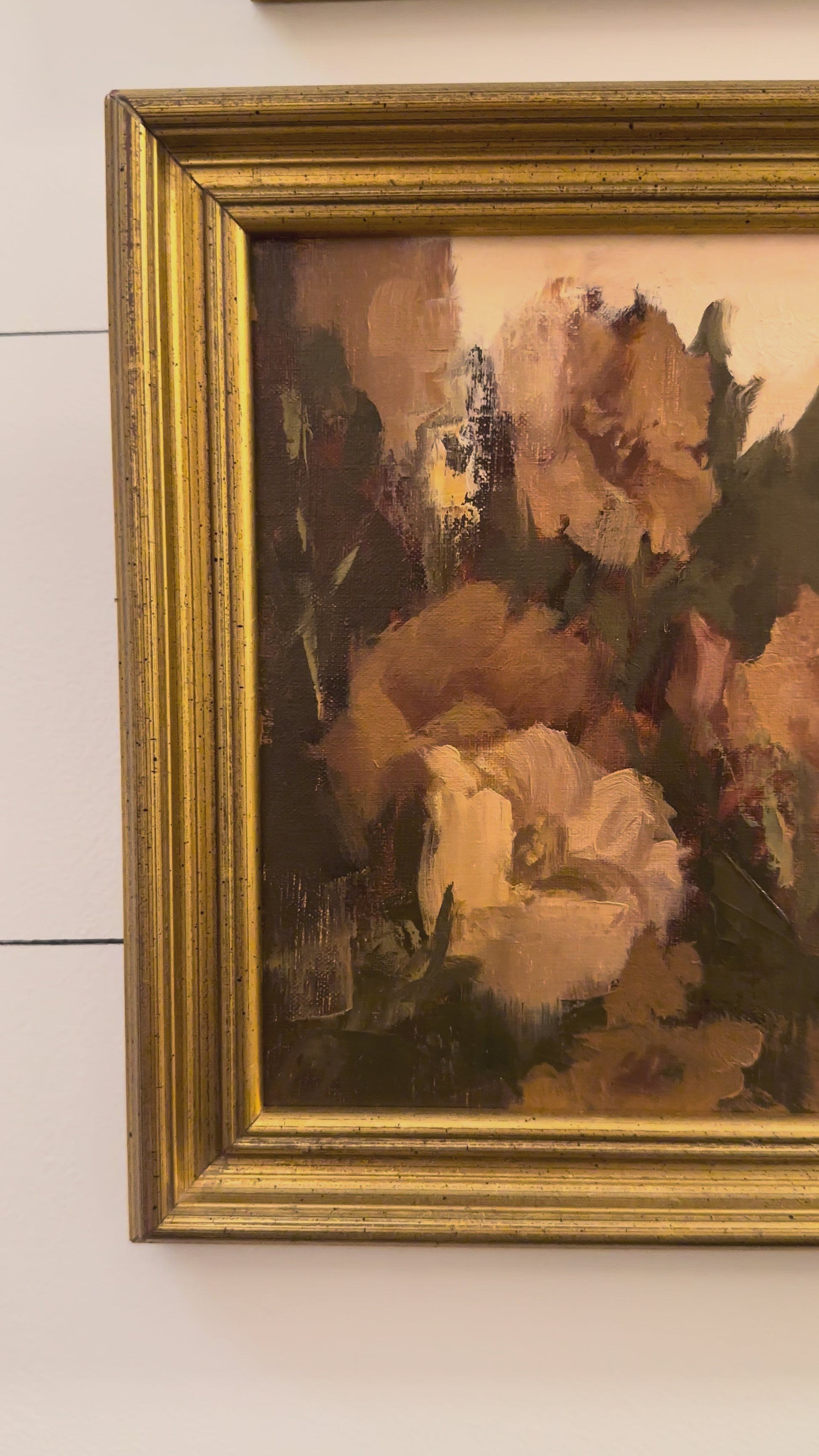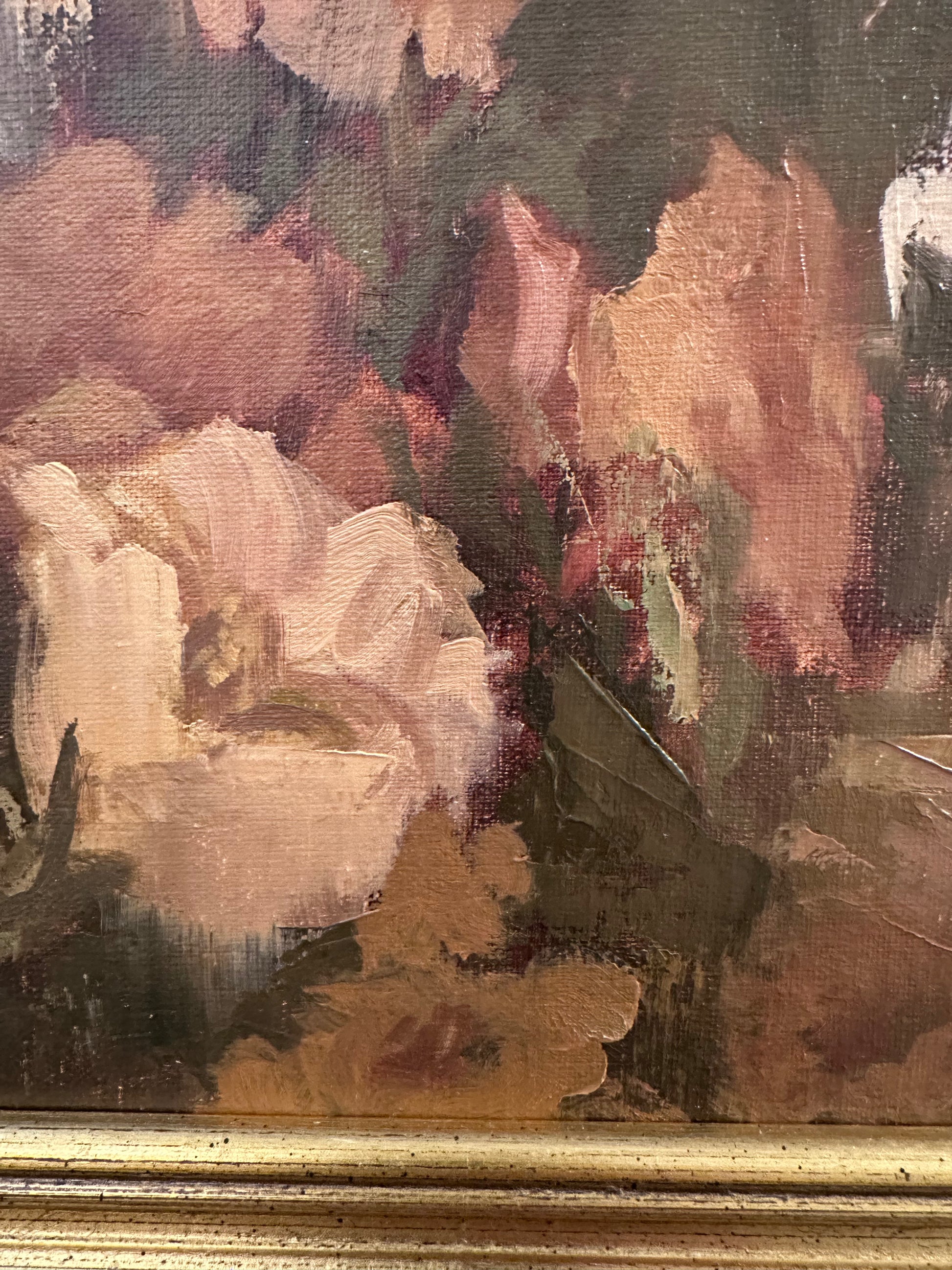 This oil painting is 10” tall and 22” wide which includes this pretty gold frame. This painting has a warm white sky and the flowers are a dusty rose color with warm green foliage. This painting is wired and ready to hang on your wall.