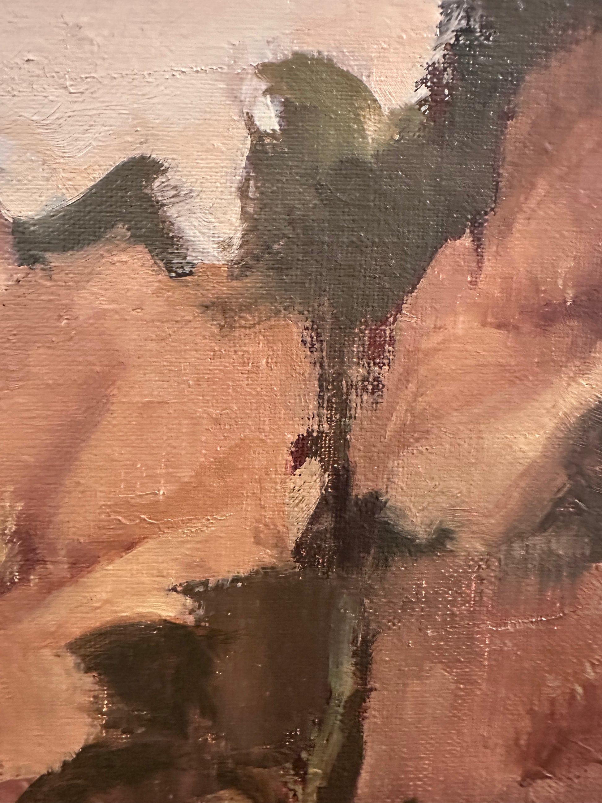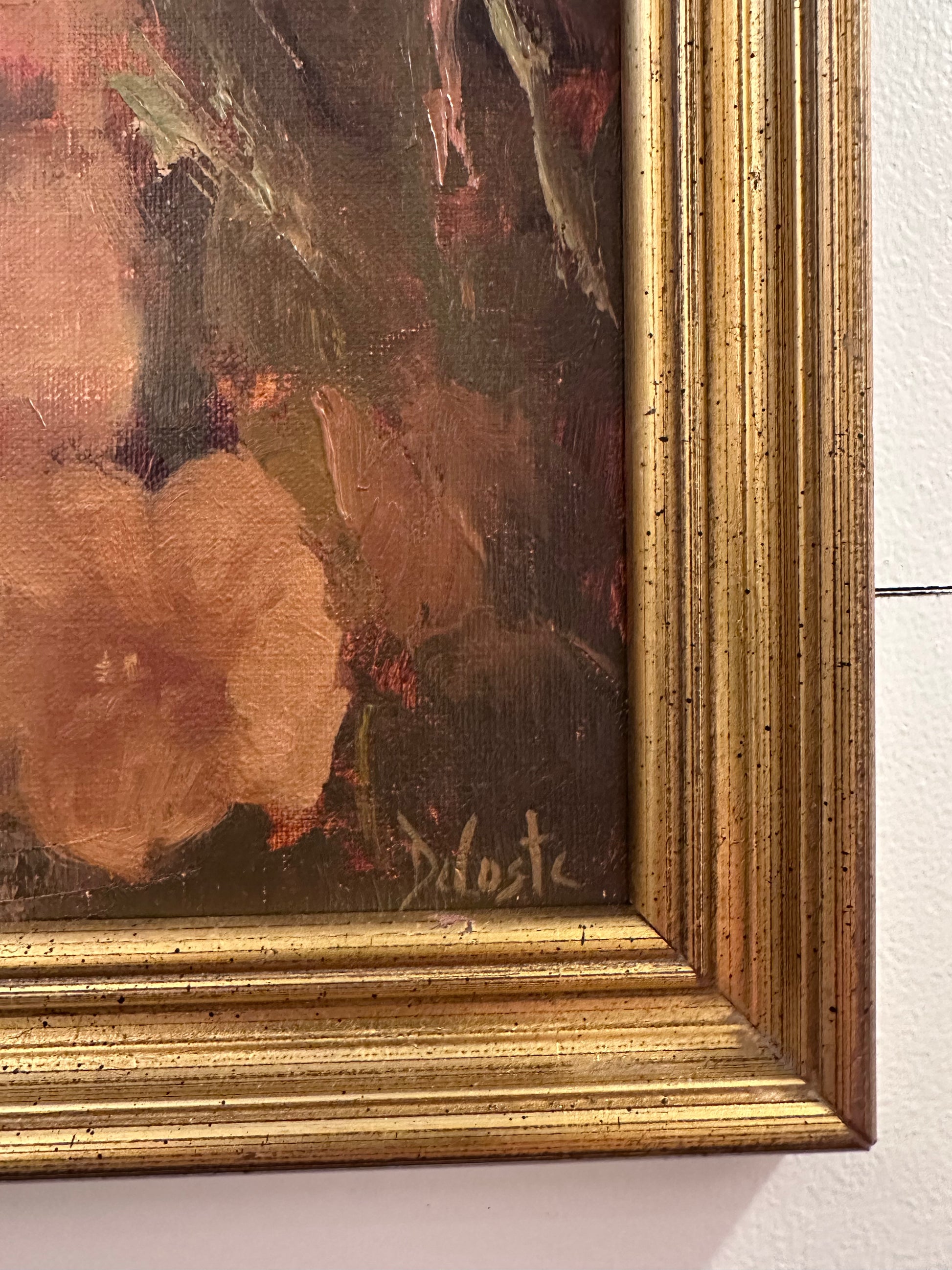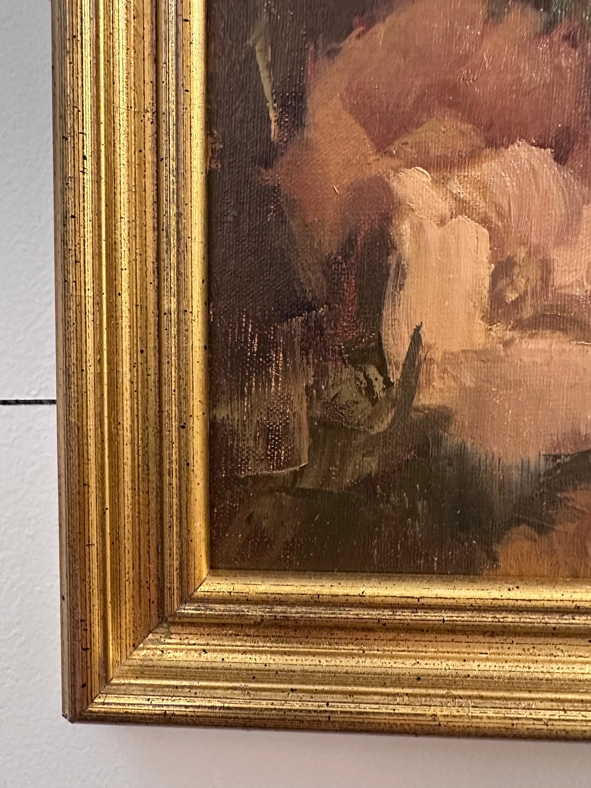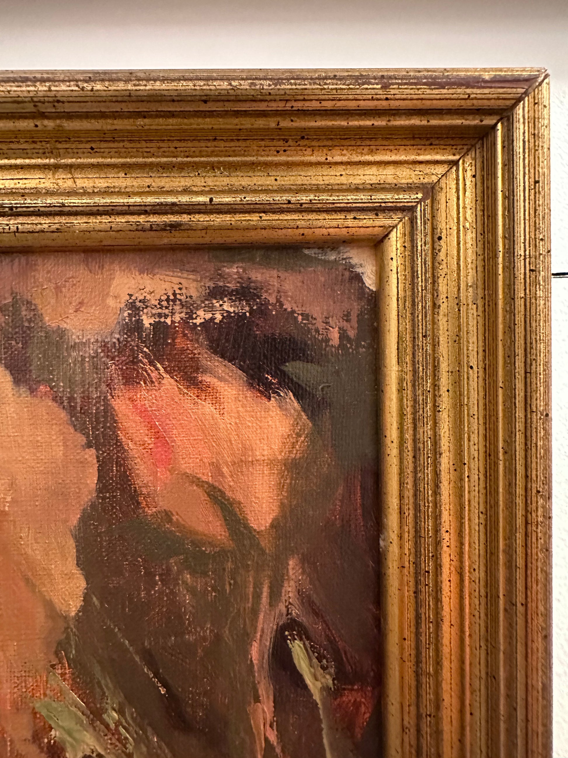 This oil painting is 10” tall and 22” wide which includes this pretty gold frame. This painting has a warm white sky and the flowers are a dusty rose color with warm green foliage. This painting is wired and ready to hang on your wall.