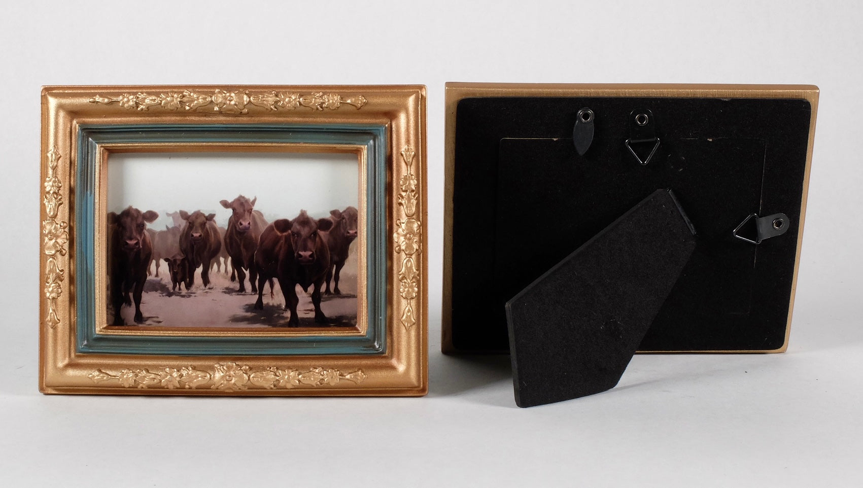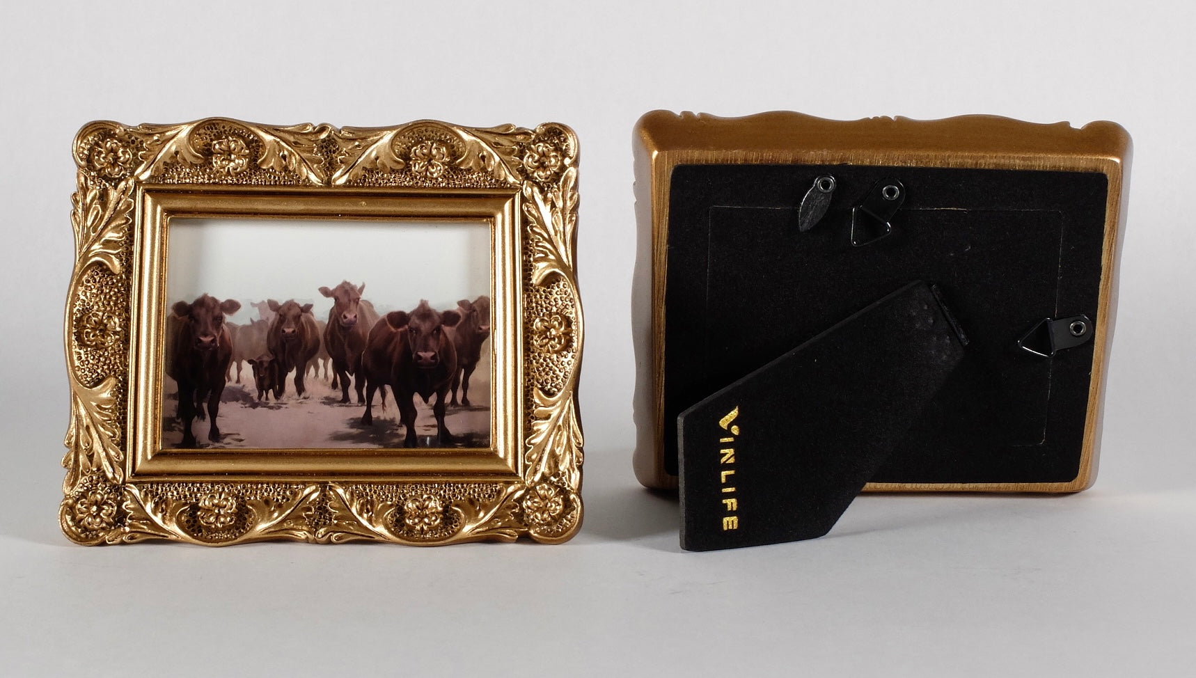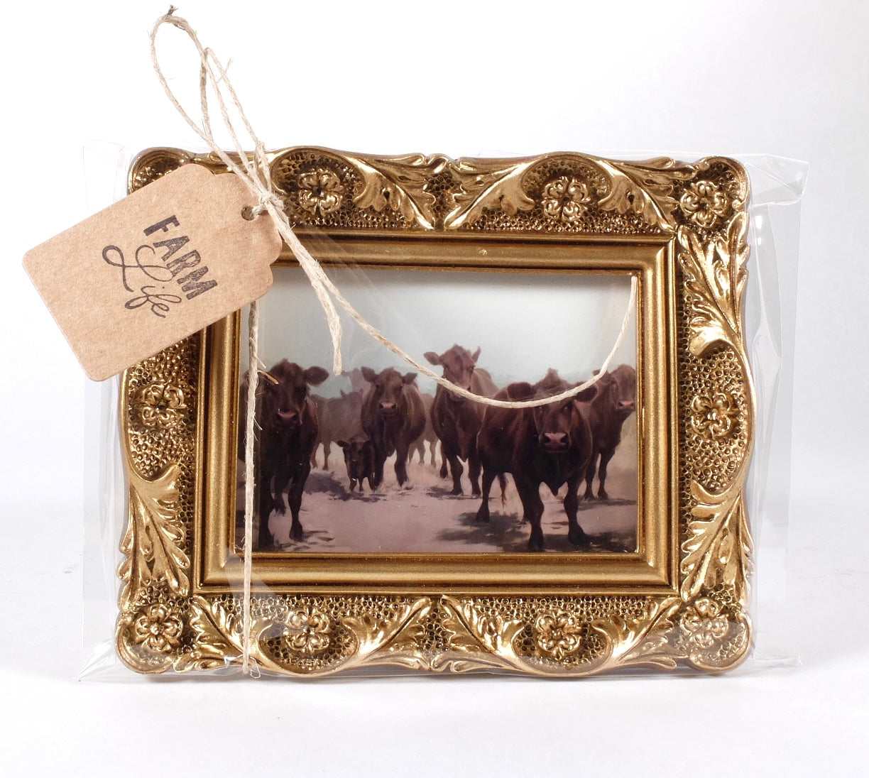 These mini framed prints are roughly 4"x 5" (varying slightly depending on the frame style). These can sit on a tabletop/shelf or can hang on a wall.