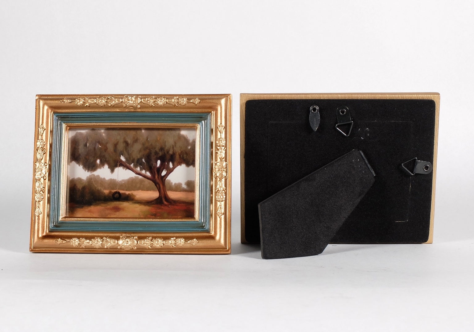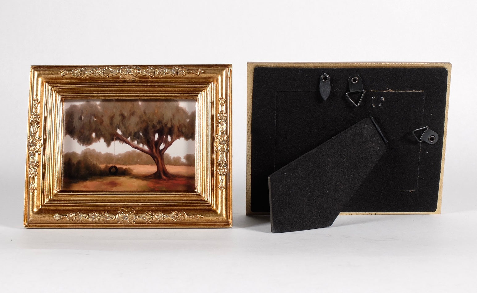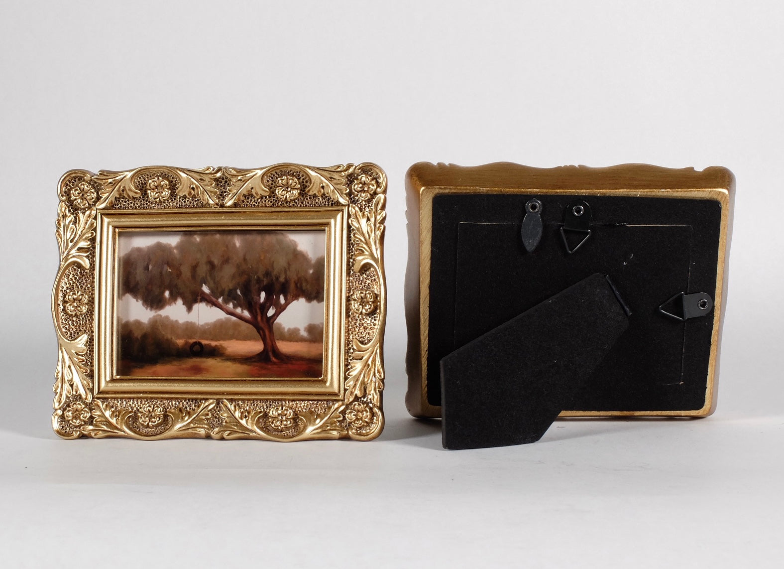 These mini framed prints are roughly 4"x 5" (varying slightly depending on the frame style). These can sit on a tabletop/shelf or can hang on a wall.