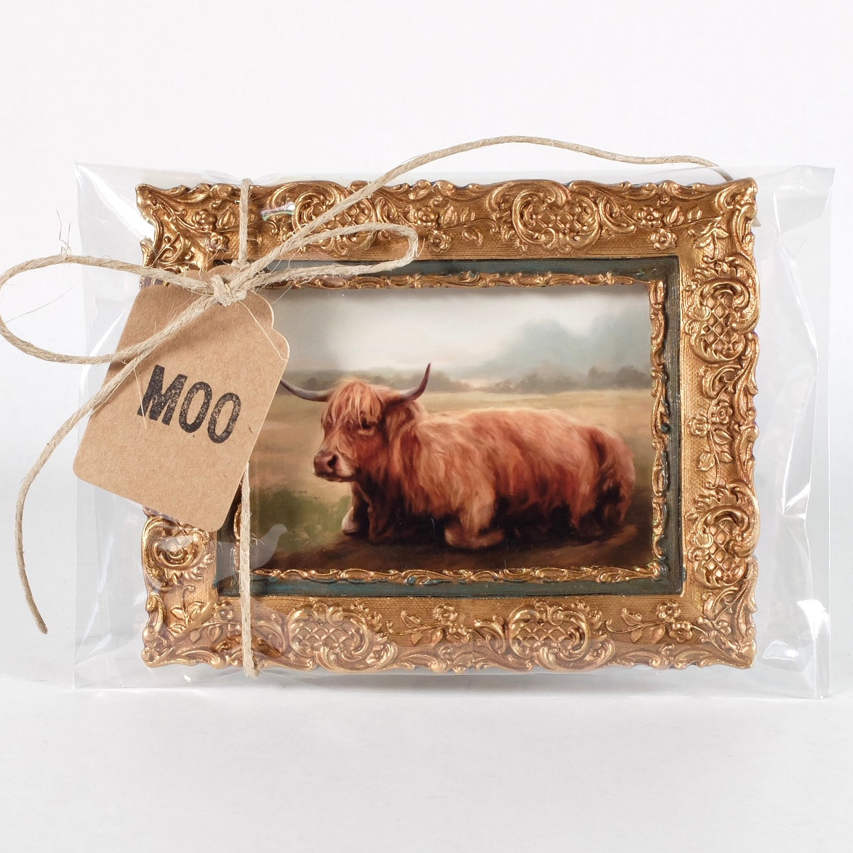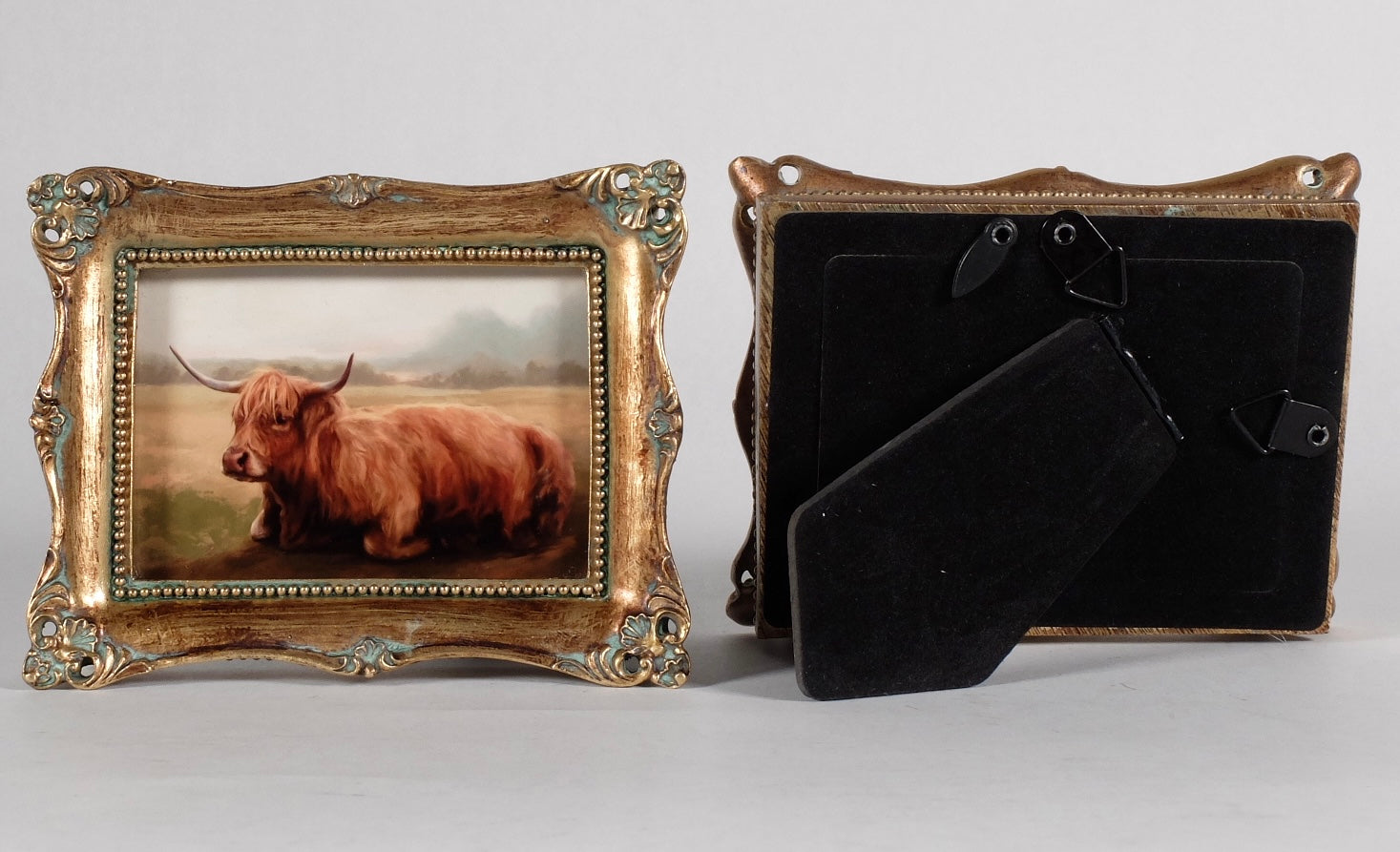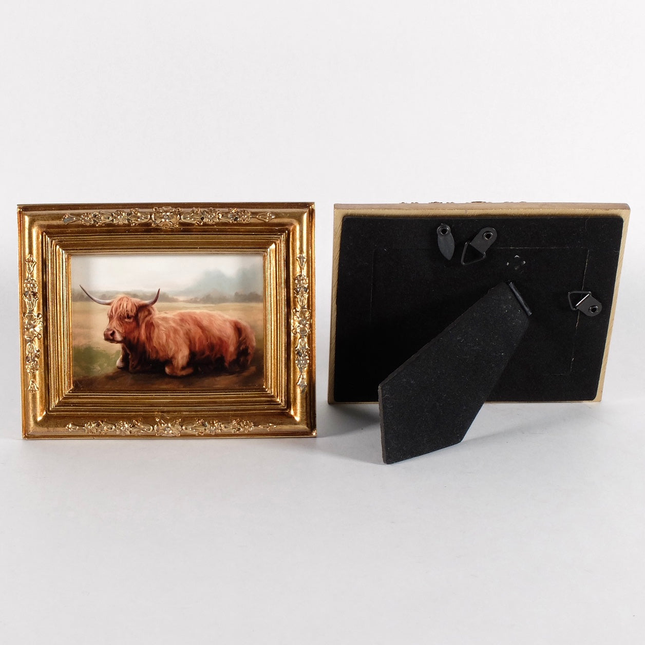 These mini framed prints are roughly 4"x 5" (varying slightly depending on the frame style). These can sit on a tabletop/shelf or can hang on a wall.